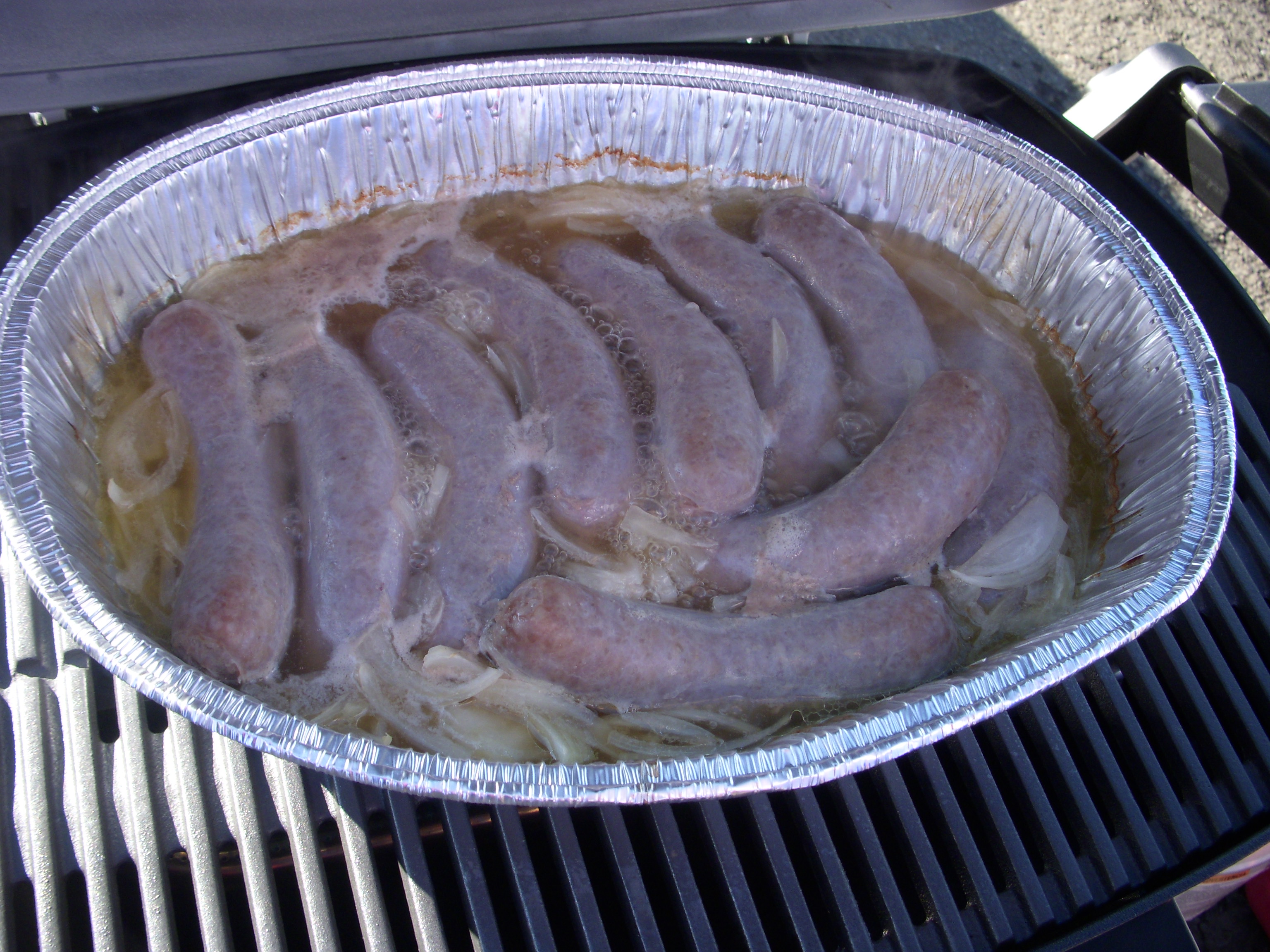 Our friends took care of everything else, which was really awesome of them. After we warmed up with cups of chili, the brats were next up on the grill. First they were cooked in a pan with onions and beer.