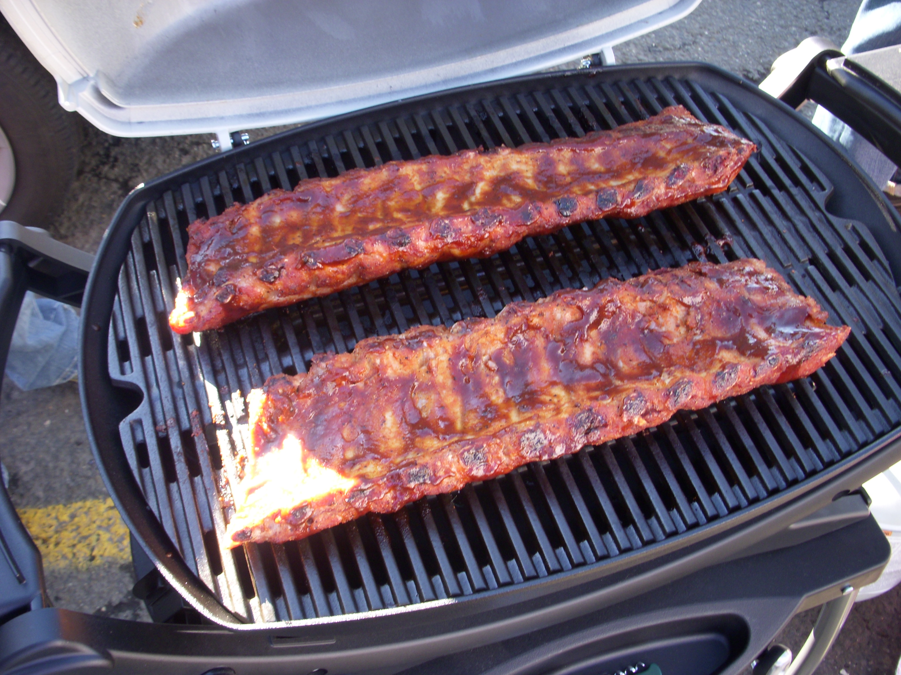 Two giant racks of ribs on the grill