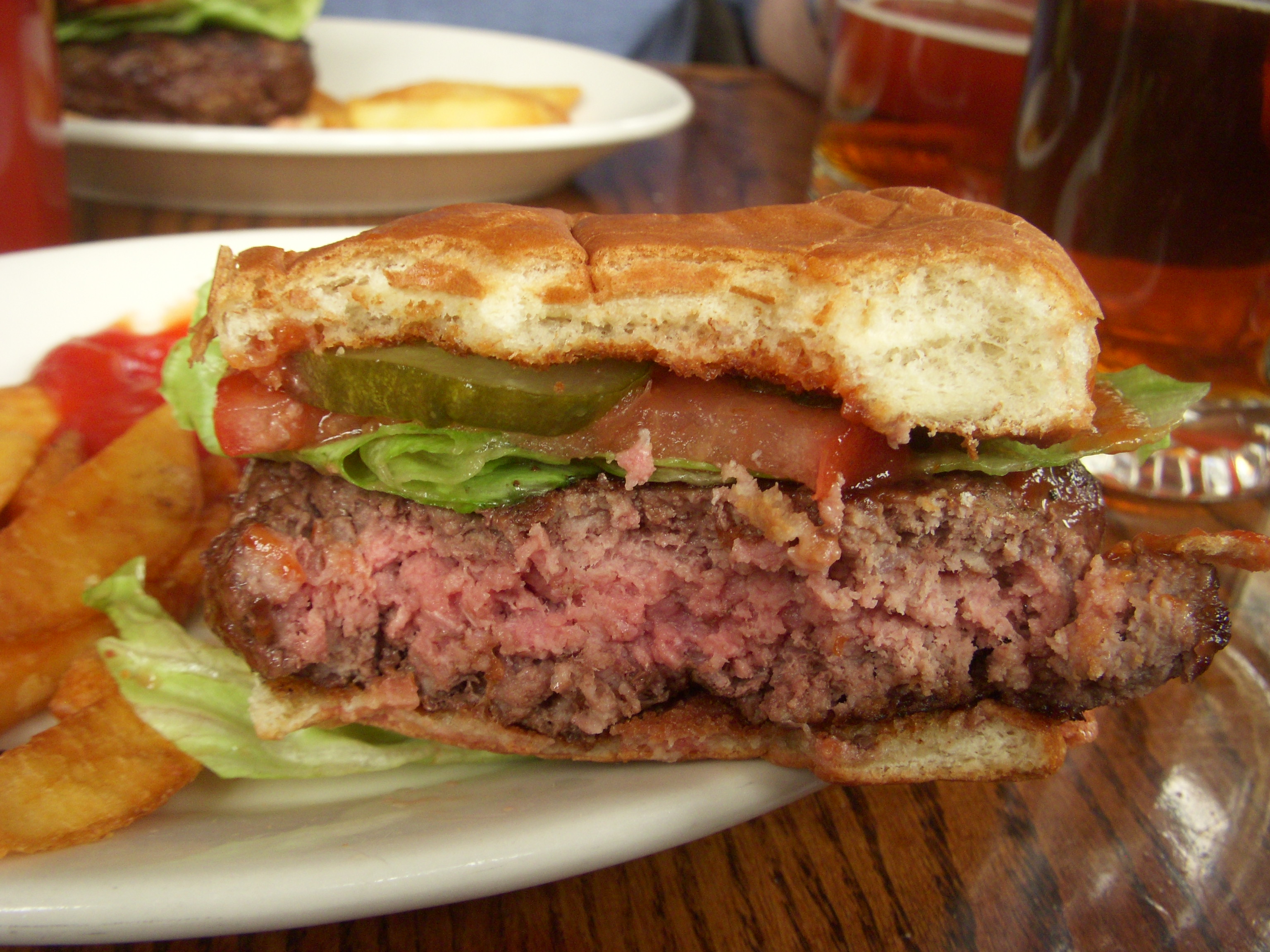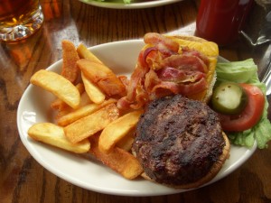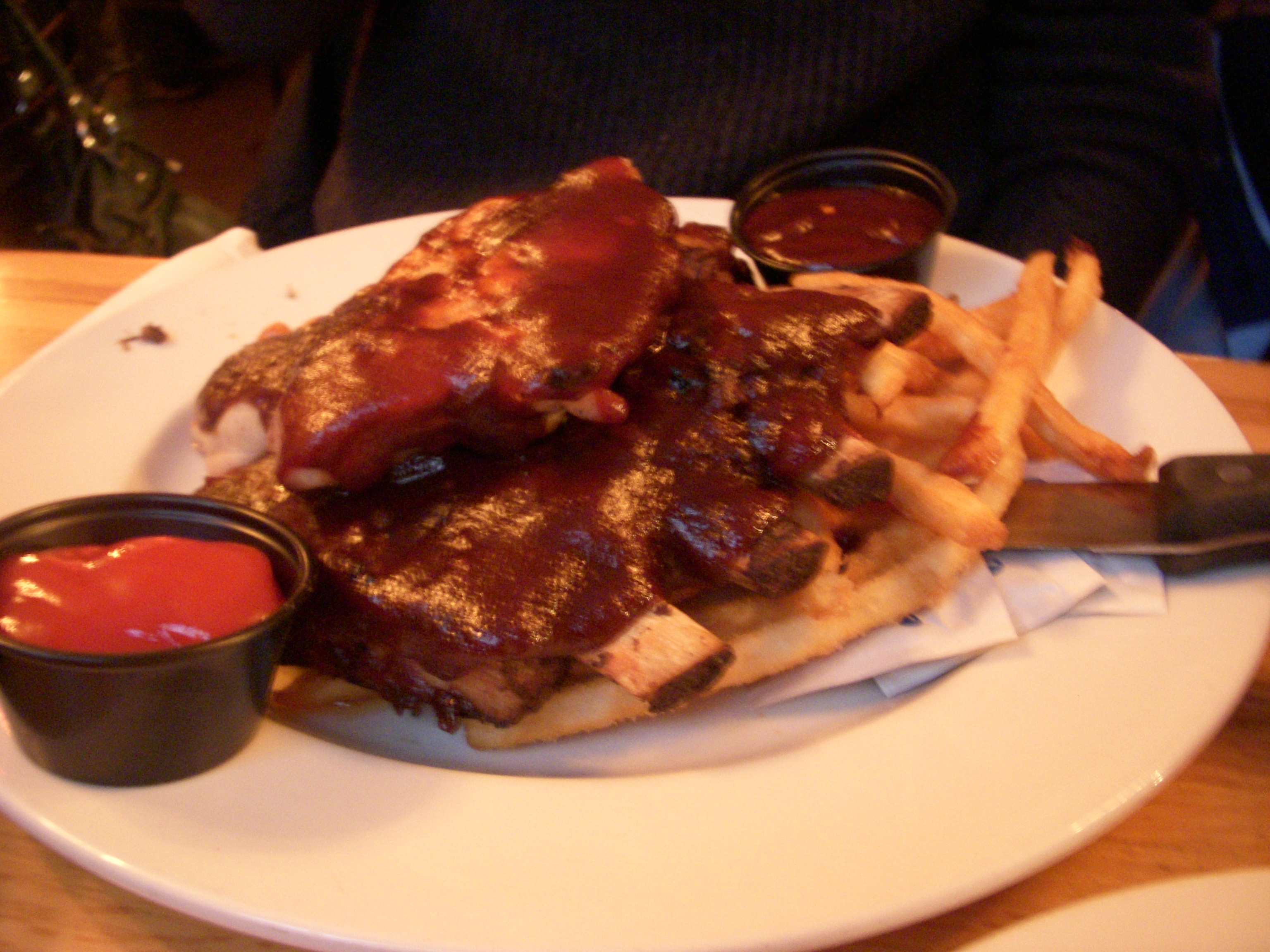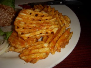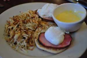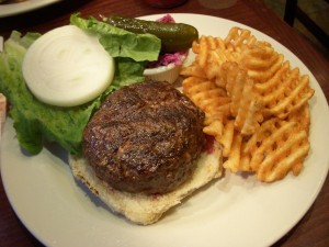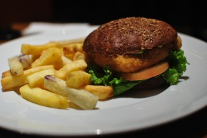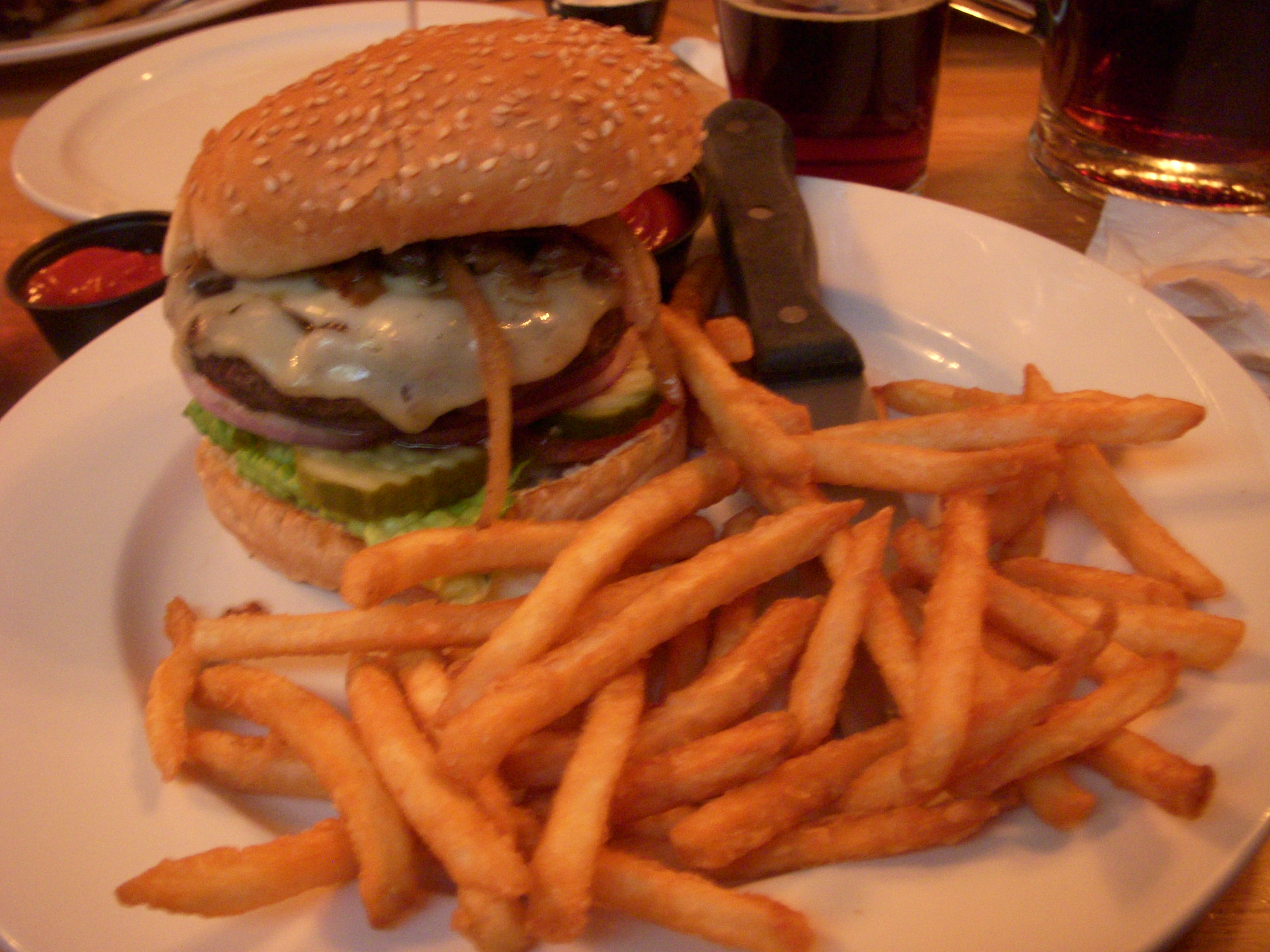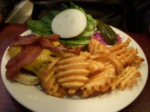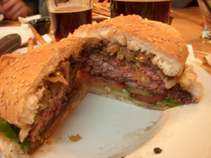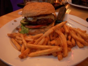 In Montreal, our bar of choice, Brutopia on Crescent Street, was way too crowded for us to bring J in, so we settled for Les 3 Brasseurs, which is much bigger and had space for us and J’s stroller at the front of the bar. Les 3 Brasseurs looks like a chain restaurant, but they do brew their own beer (the name translates to The 3 Brewers). We tried the brown and the amber. The amber packed a decent punch, but the brown was slightly disappointing. It had won a few awards so we were expecting a bit more complexity in flavor.