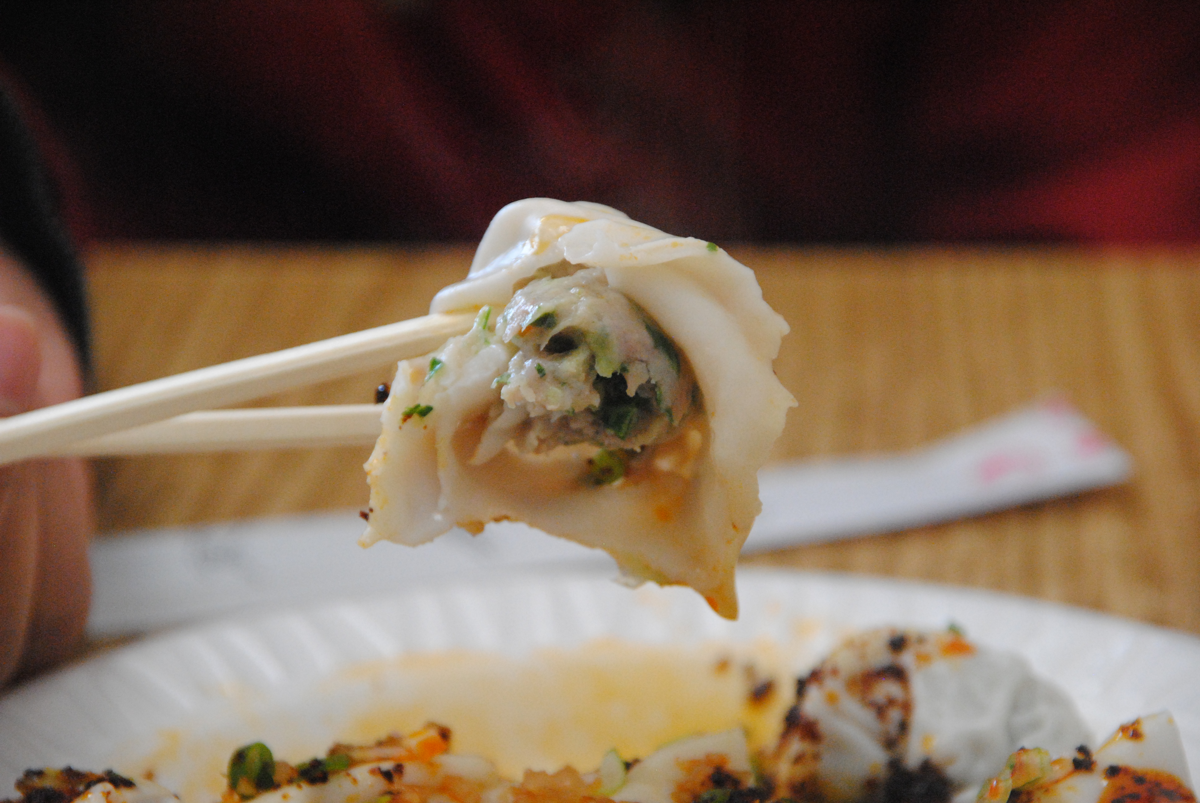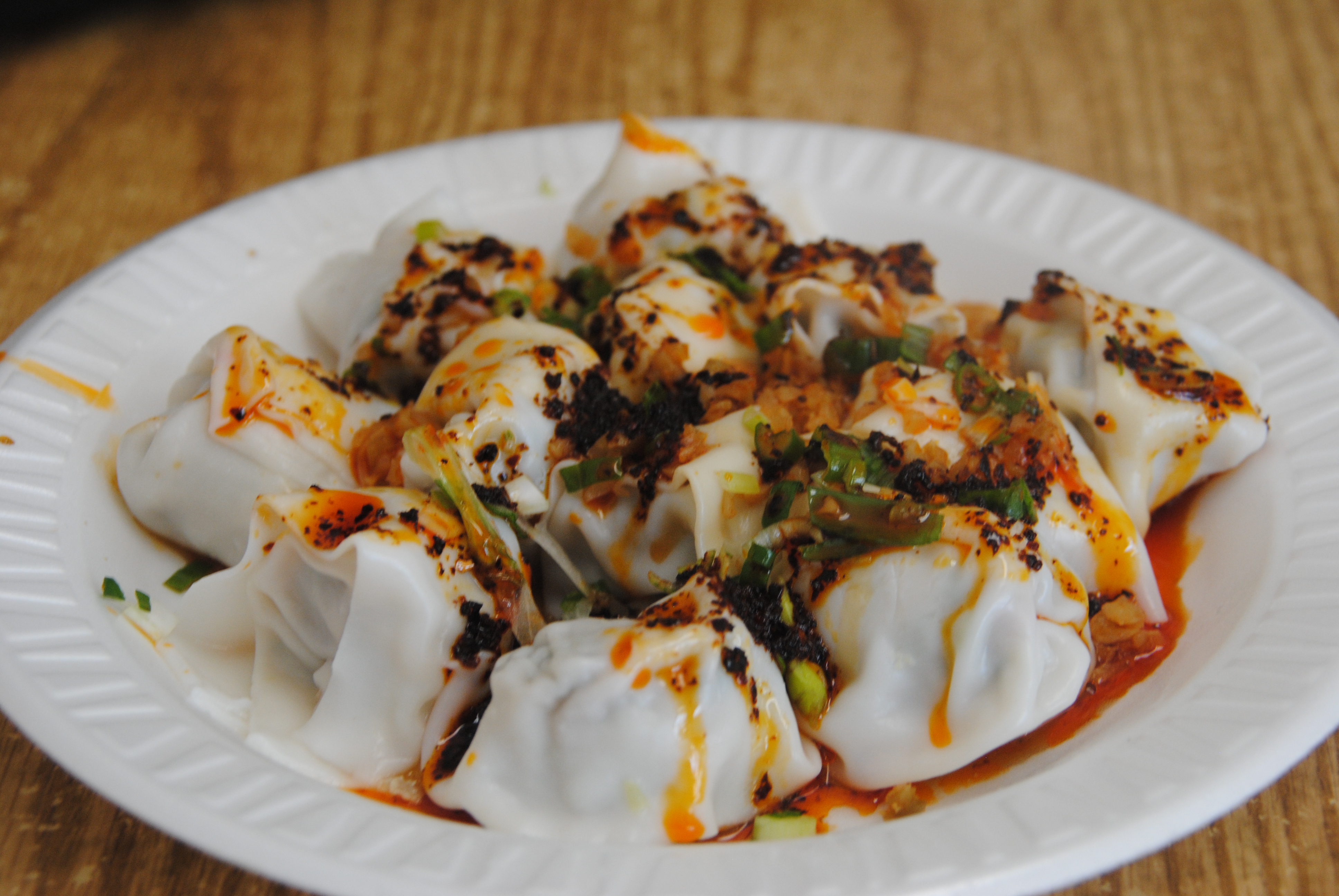The sauce tasted a little peppery, and there was also some minced pickled vegetable sprinkled over the top that added a slight sourness that complemented the savoriness of the dish. These wontons were probably my favorites of the day, and at $4.50 for a dozen, pretty reasonably priced as well.