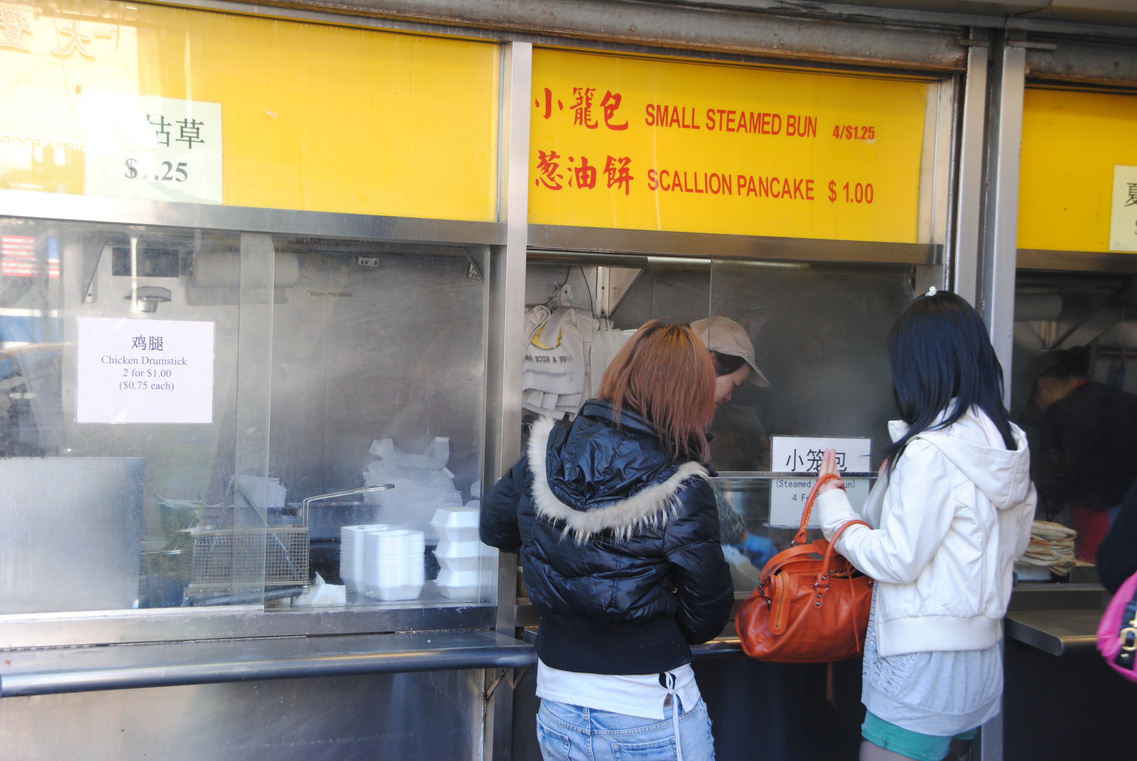 We headed towards the Flushing Mall for some shaved mango ice but I got sidetracked along the way when we passed some takeout windows (AA Plaza) under the railroad overpass that boasted scallion pancakes for $1 and 4 steamed pork buns for $1.25. How could I resist?