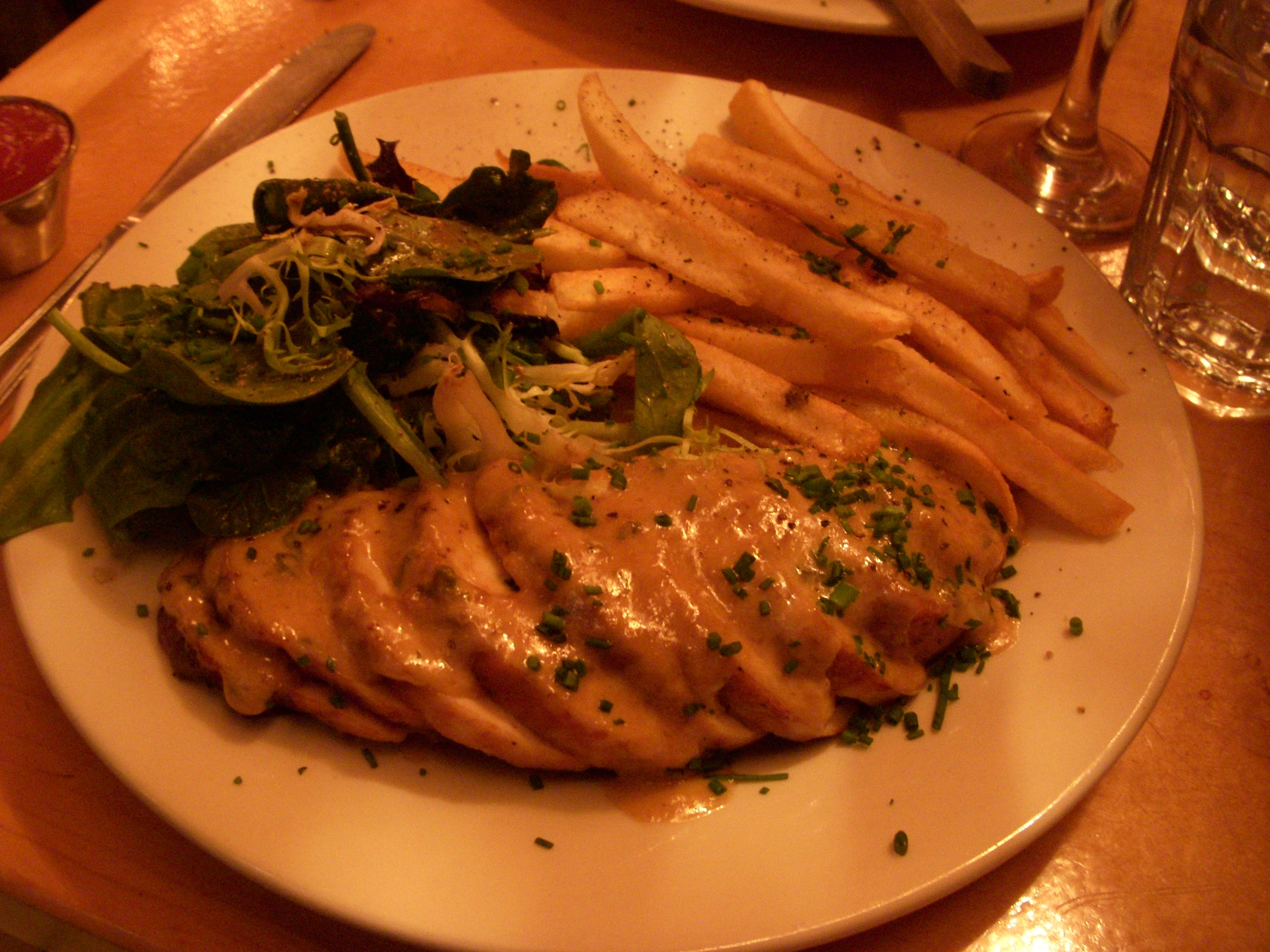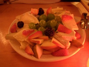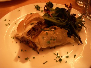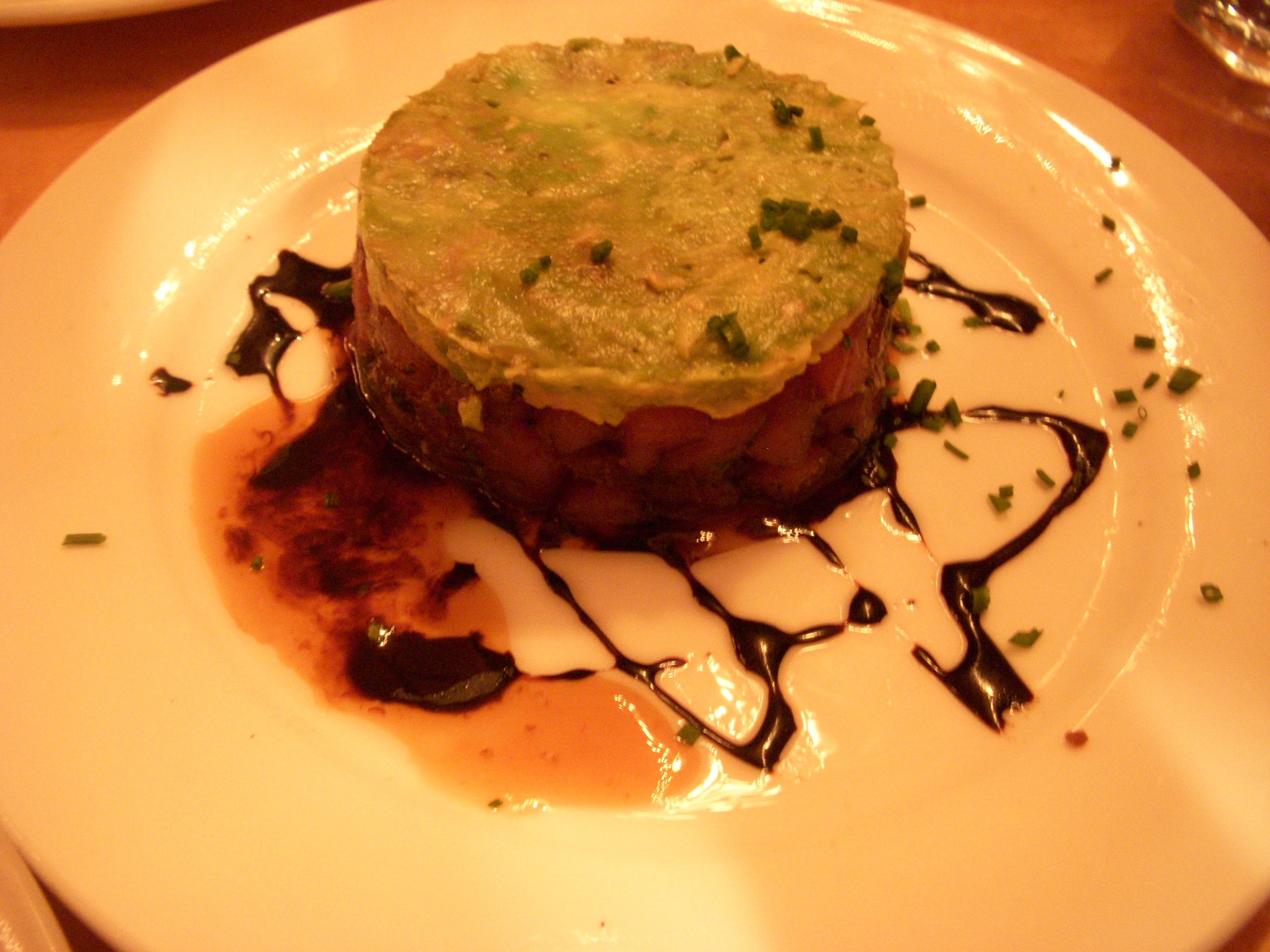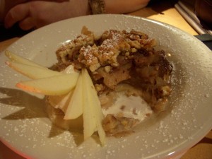 Josh finished his duck first and dug into the pork chop, still having to reach awkwardly across his duck plate. The pork chop was massive, probably the thickest pork chop we’ve ever gotten at a restaurant, and was cooked through to medium as the chef recommended. It was served on top of a bed of black bean tinga, which is a Mexican style sauce made with chipotles. I thought the beans were just slightly too al dente for my taste, but Josh disagreed and liked that they had texture to them. There was a spiced avocado mash on top of the pork, but I didn’t taste any of the orange ginger glaze that was mentioned on the menu. I thought the pork was seasoned well and the dish had a lot of flavor to it, but it didn’t really wow us. We felt like it was something we can make at home, and Josh’s mom has a similar dish in her repertoire that involves simmering pork chops and black beans in a combination of salsa and tomato sauce. Obviously this was a much more refined dish than the one she makes, and the quality of the pork was vastly superior, but the flavors were almost identical.
