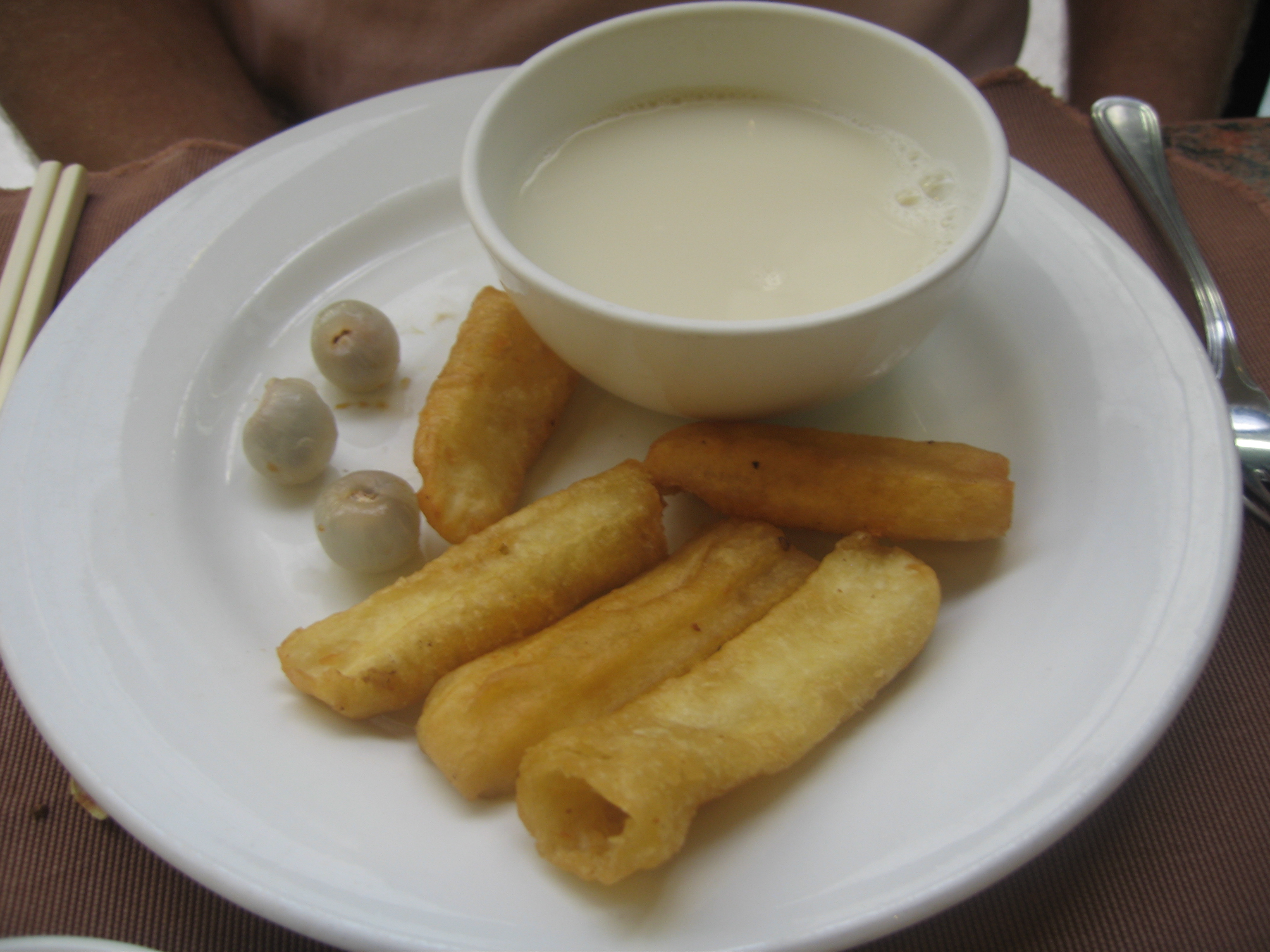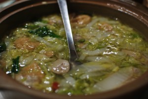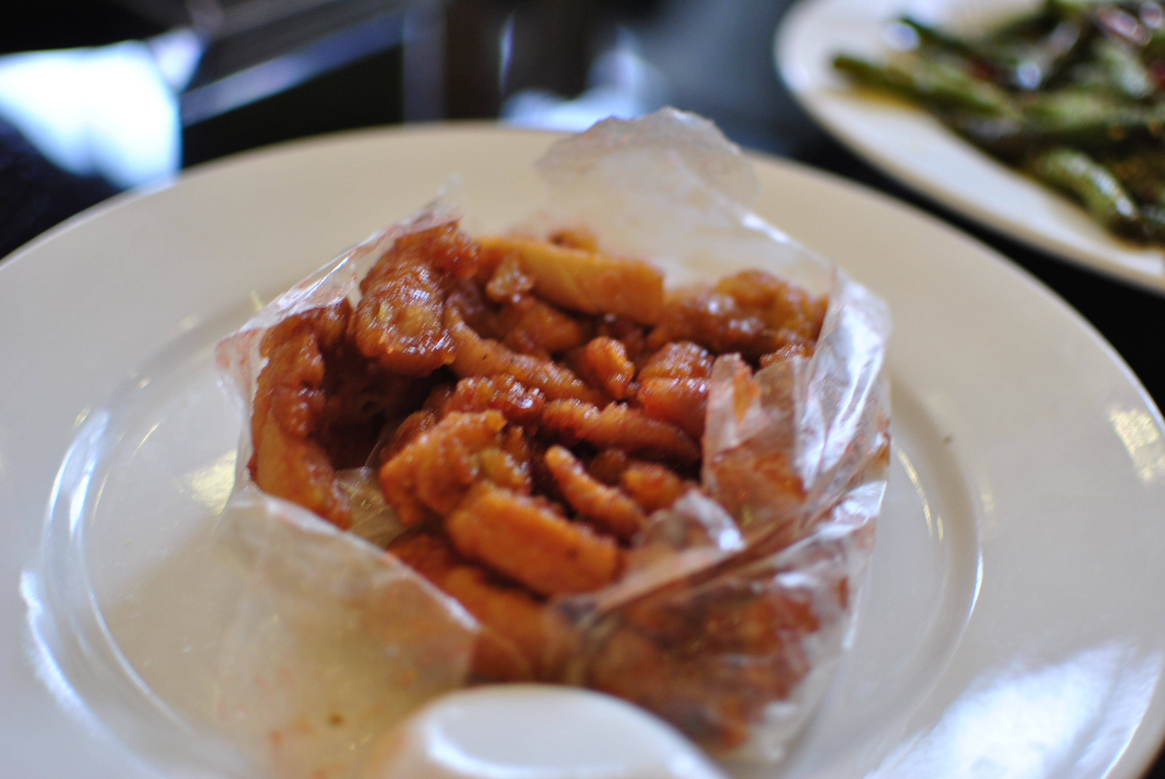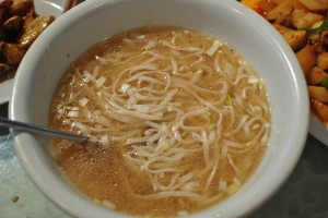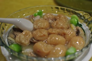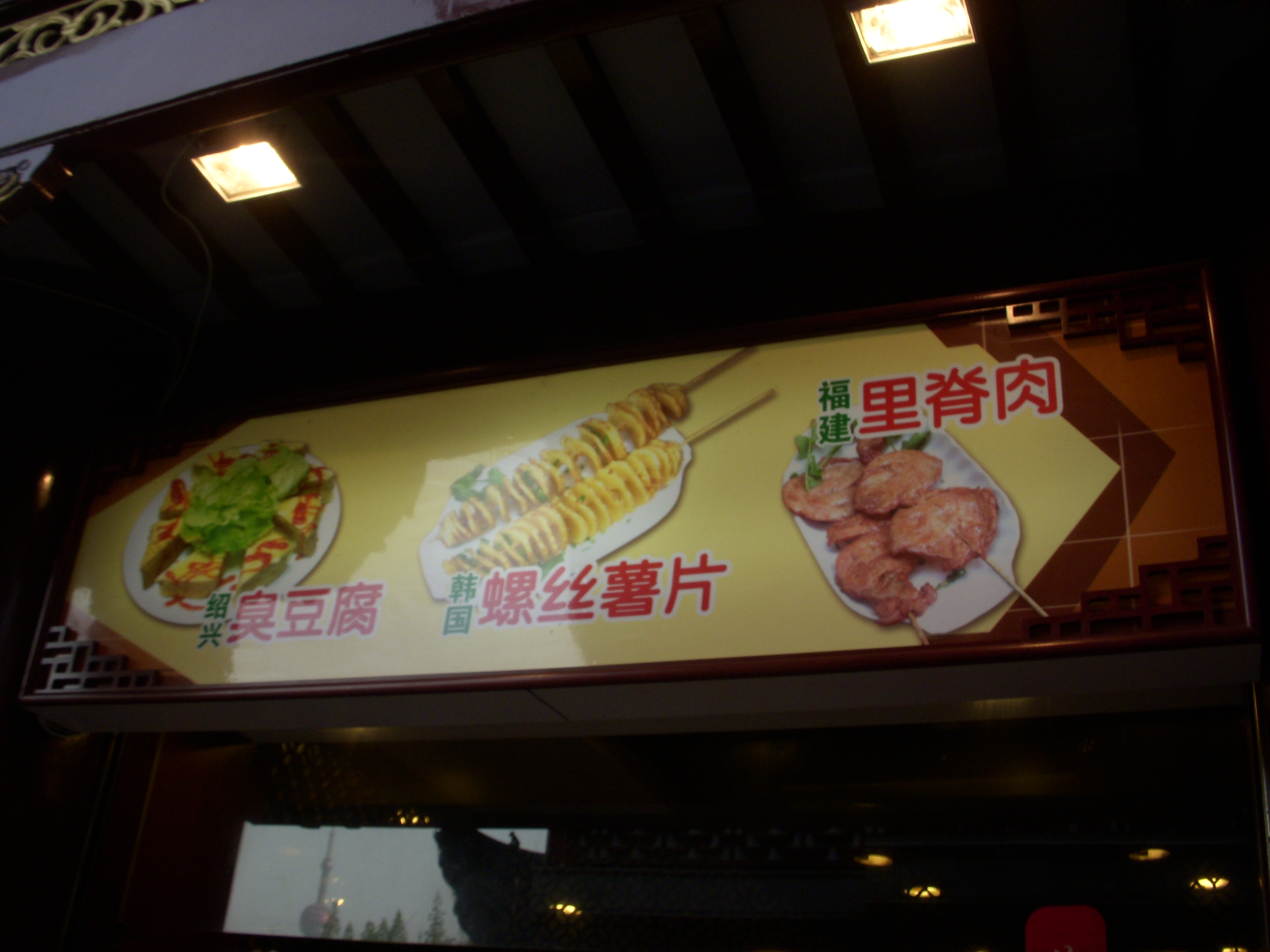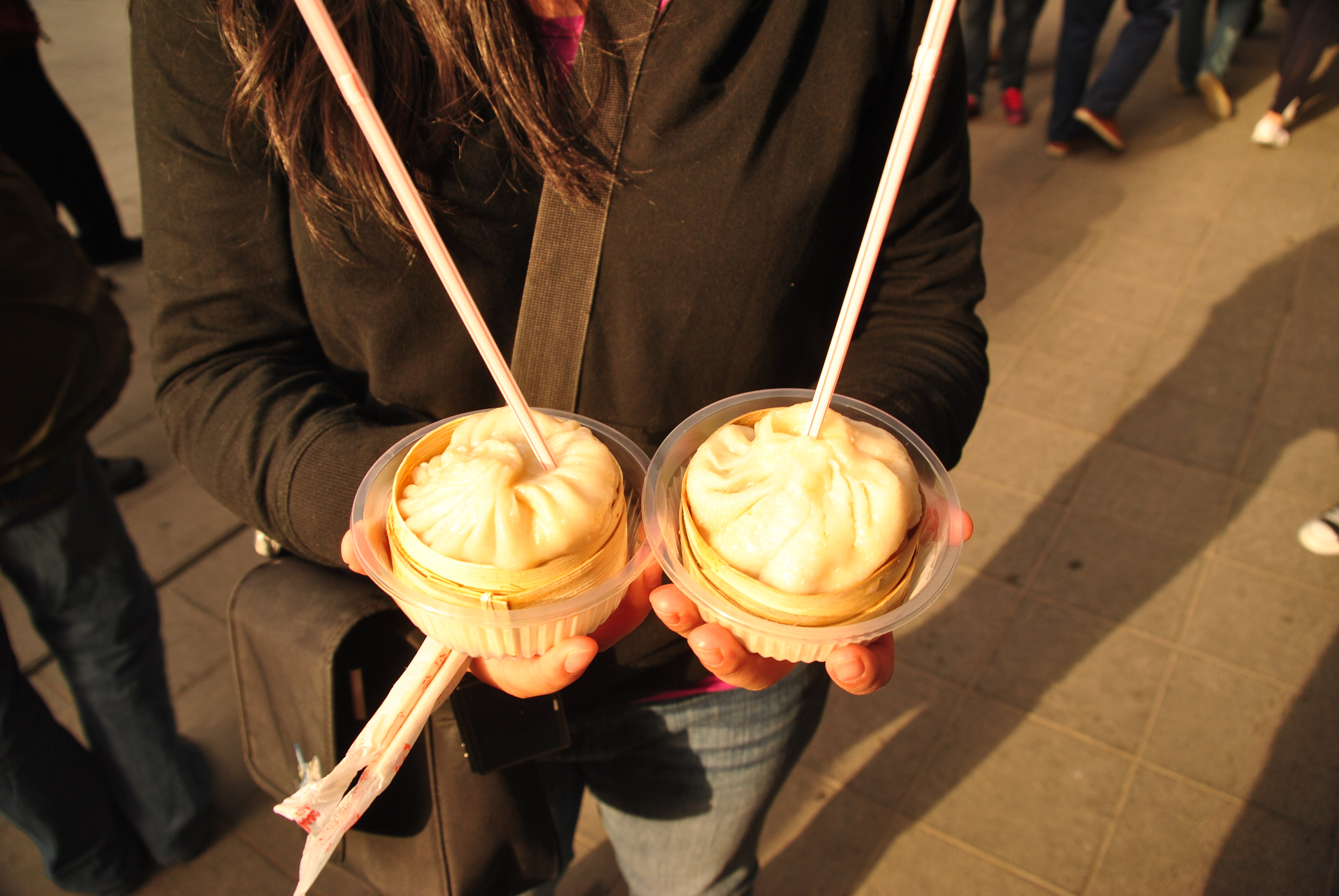 Josh, who was in Shanghai last year on a business trip, remembered a place where he got really good xiao long baos, or small soup dumplings. He ran over to where the stall was but the line was too long, and we didn’t have enough time to wait. Instead, he went to a closer dumpling stall and bought giant soup dumplings that were steamed in their own baskets. The dumplings were about the size of my fist, and came with a straw so that you could suck the soup out. That was a bit dangerous, as the soup was hot, but the broth was porky and tasty. The filling itself was pretty good, though the skin was a bit too thick. I guess that’s the only way they can maintain the shape of dumpling, given its abnormally large size.
