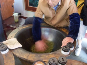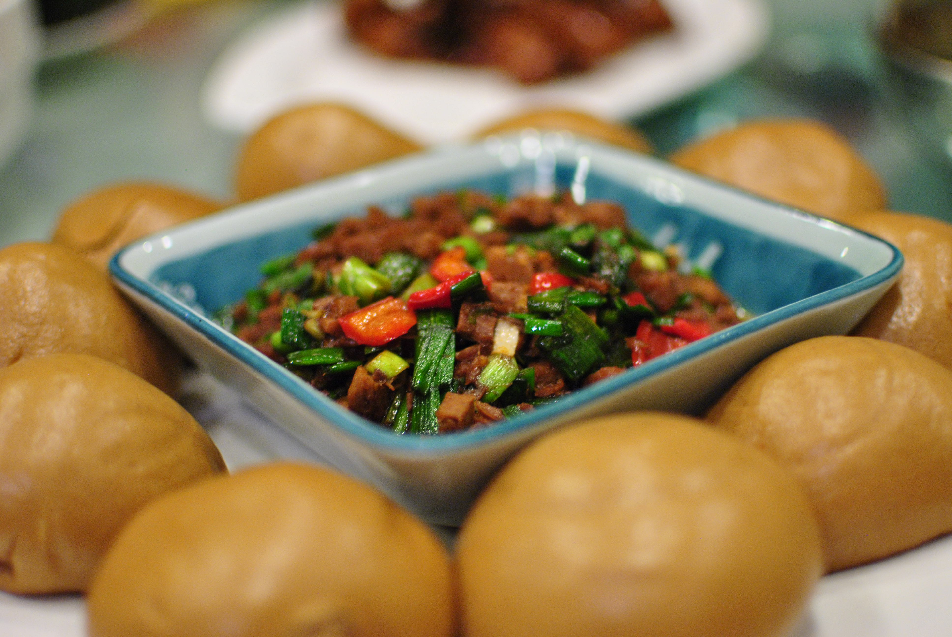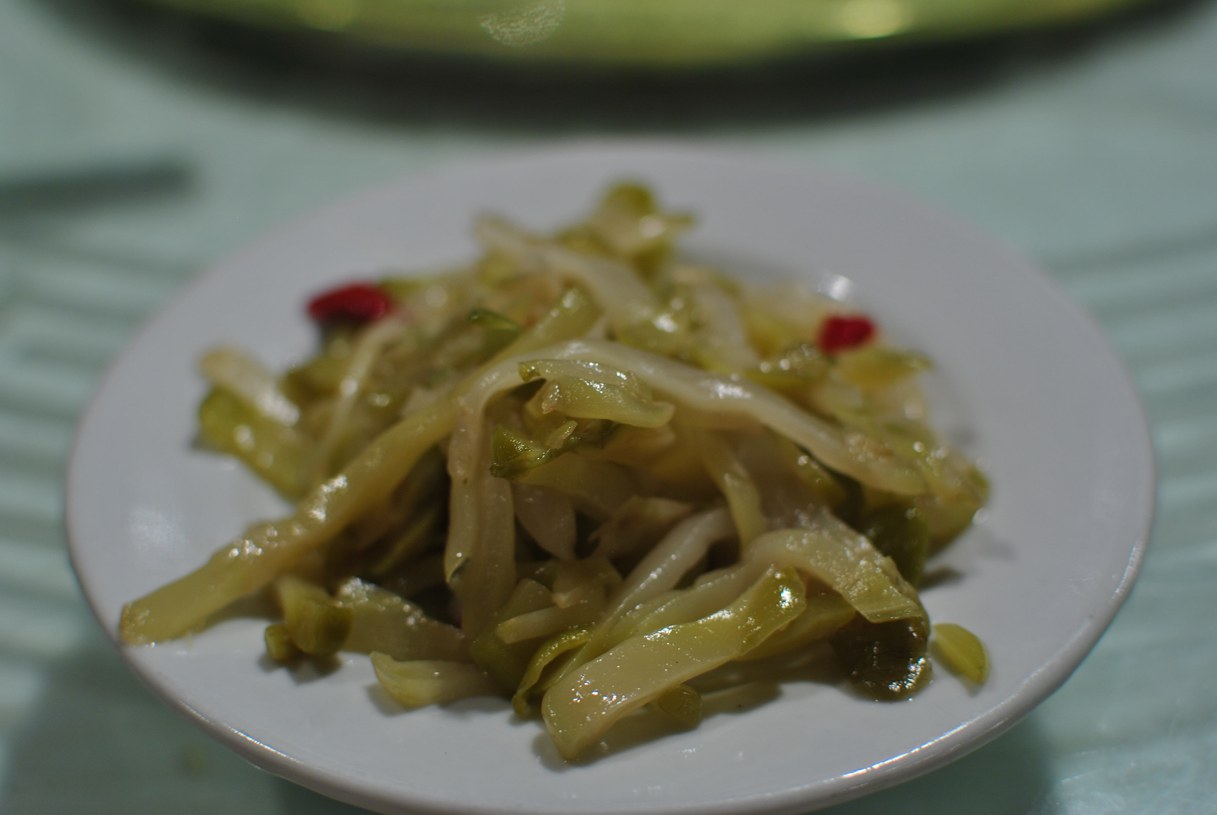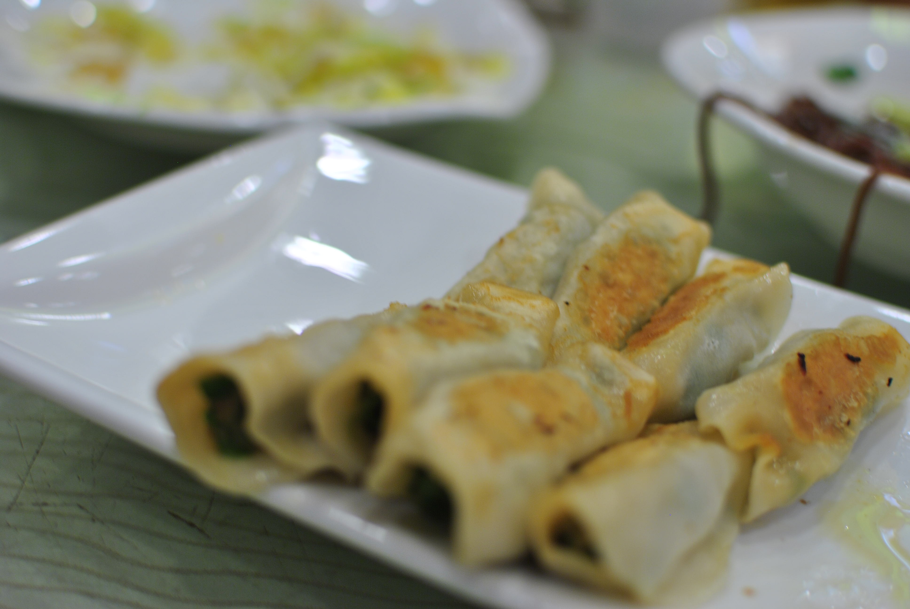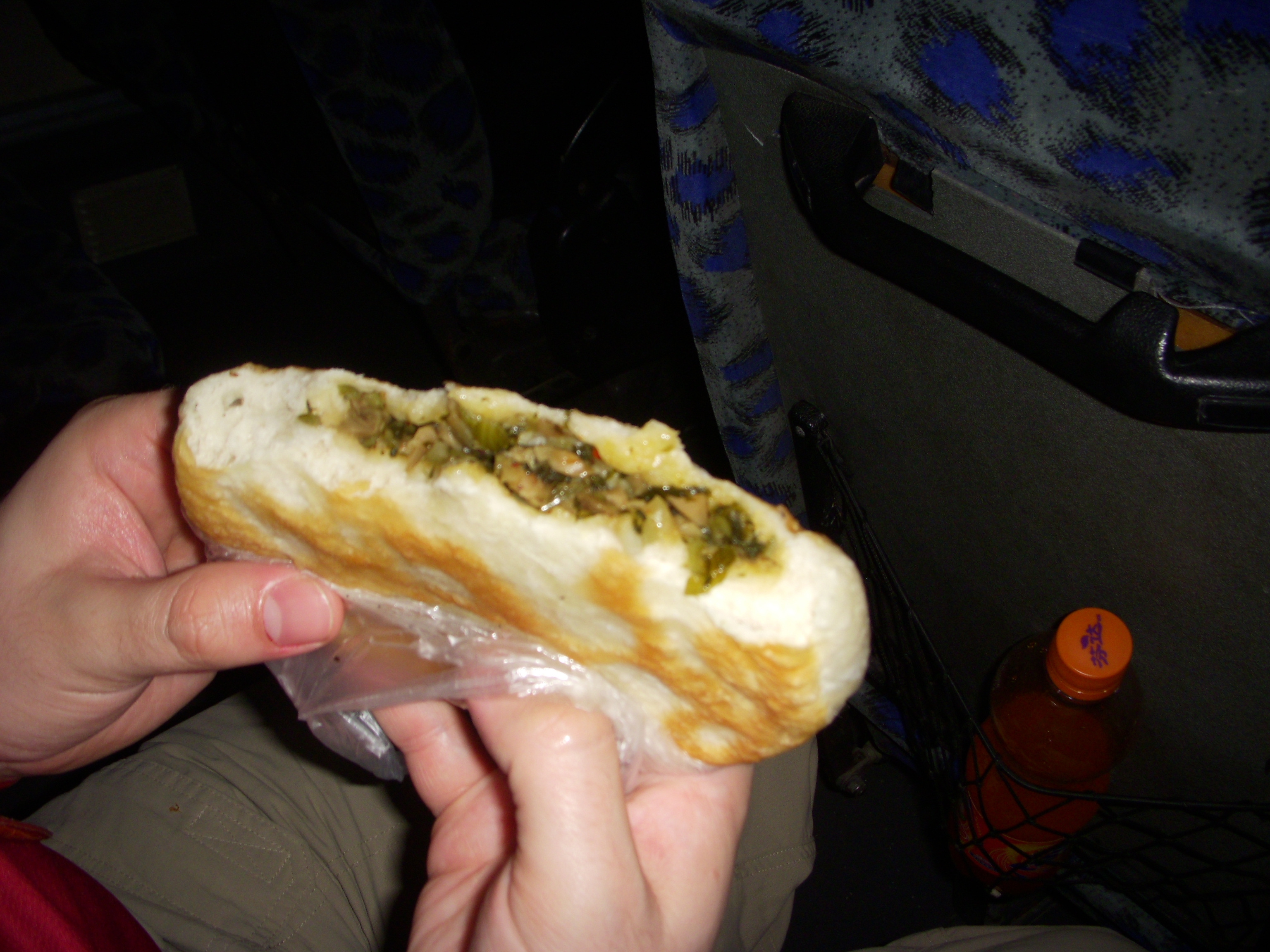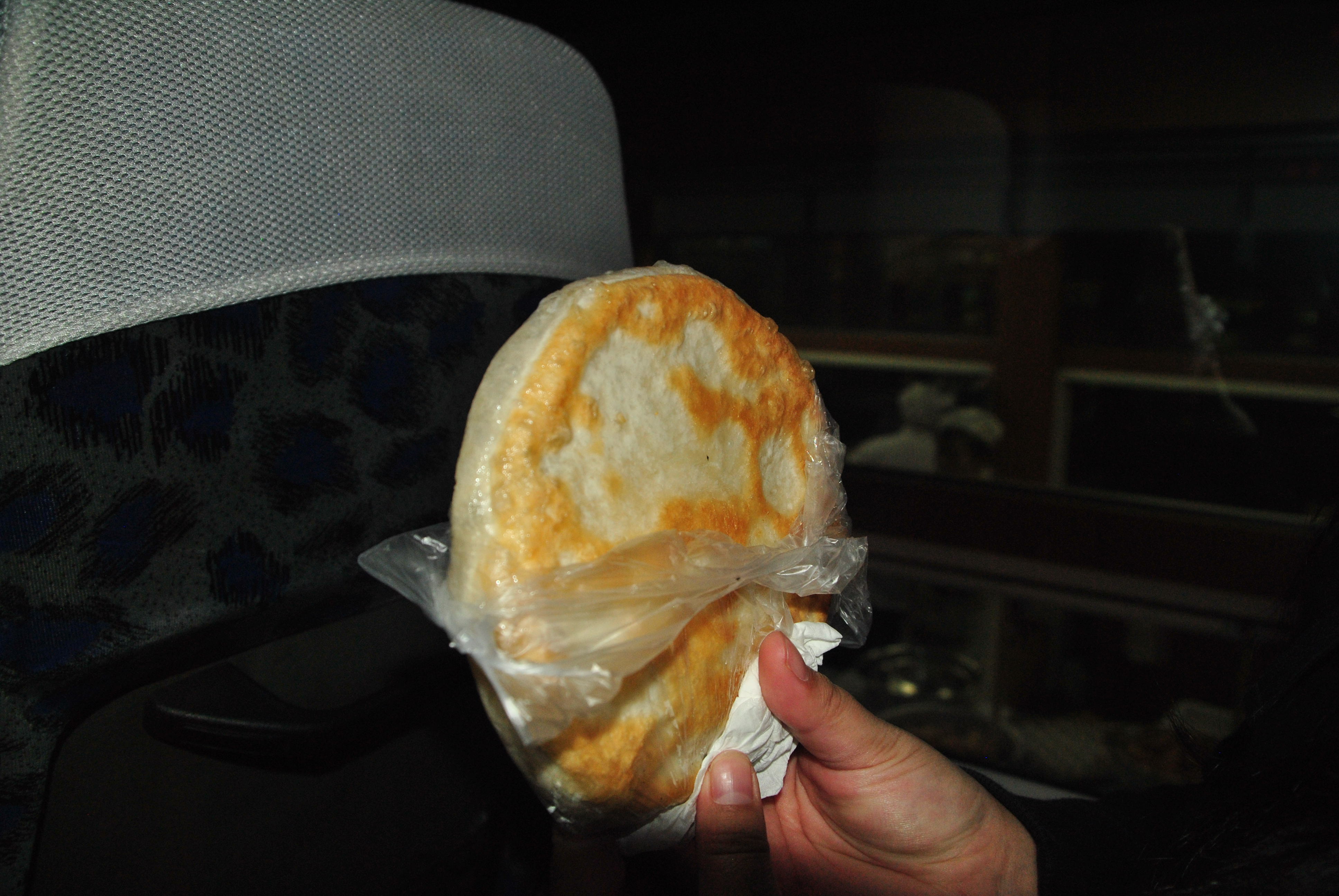 Lastly, when we got back on the bus I saw people eating giant bings – a sort of stuffed flat bun – and I immediately coveted one. So I sent Josh back off the bus to buy one for me, of course. They were made from a flour dough, filled, and then pressed down and pan fried in oil. The outside was lightly browned and the inside was filled with suan chi – a sort of preserved pickled vegetable. It was really tasty, my favorite of all the snacks we got at the rest area, but it was also super greasy.