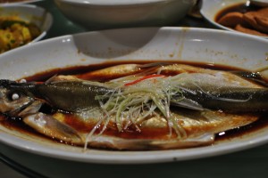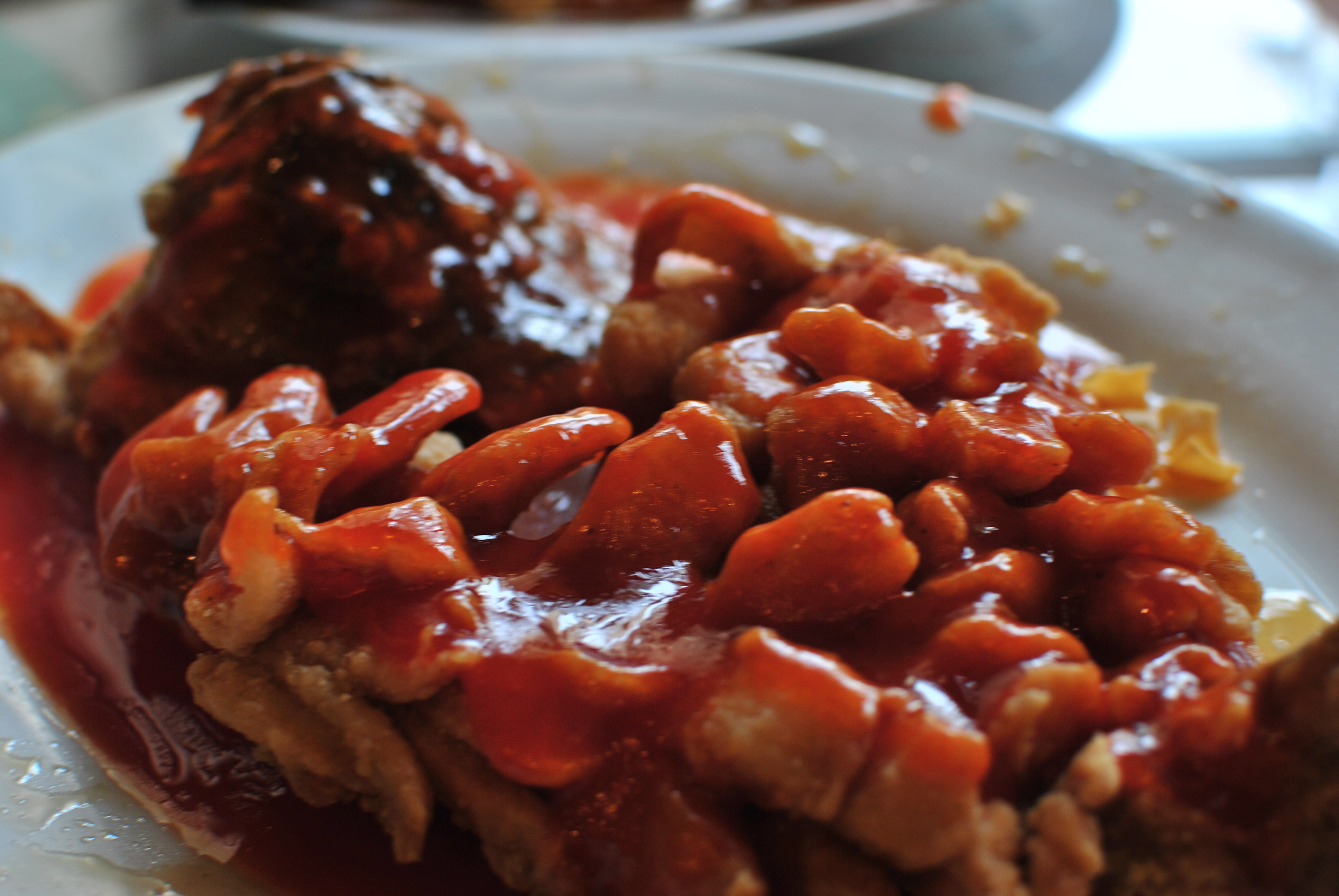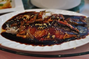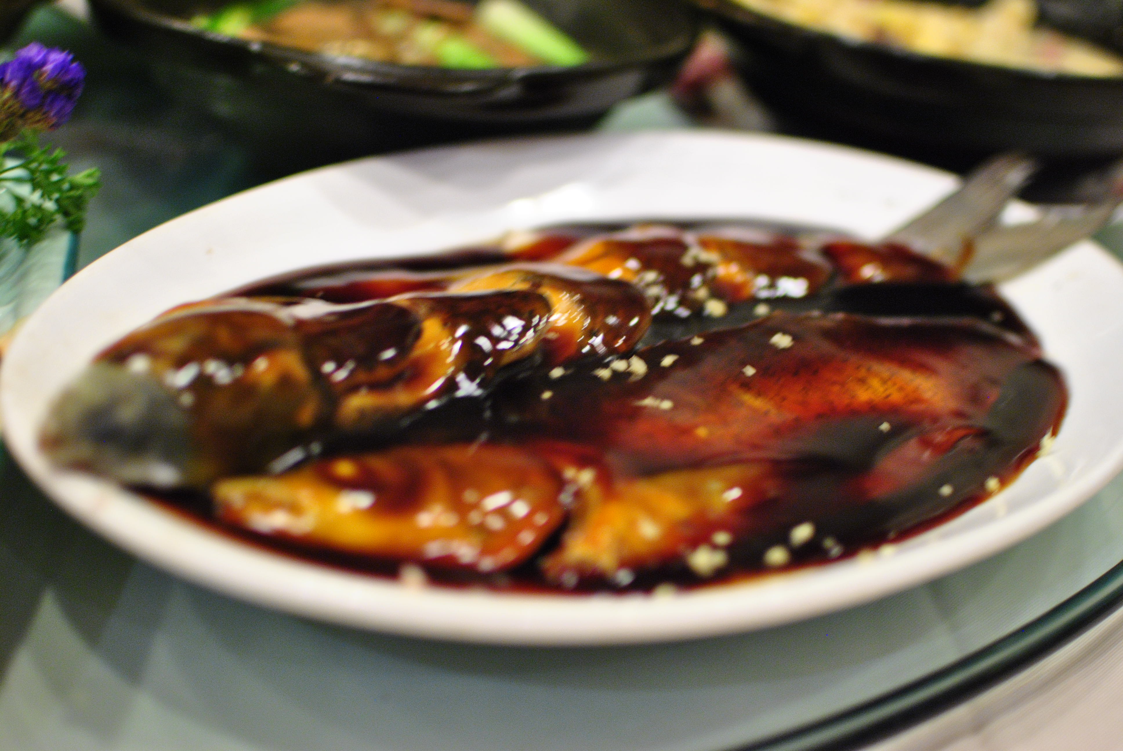 Whole fish covered in a gloppy, brown, vinegary sauce