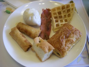Steamed bun, sticky rice, shumai, hash brown, bacon, fried spring roll