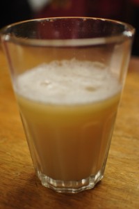 While we were sipping the frutillada, one of the restaurant workers came bounding in, holding up a pitcher of chicha triumphantly. I don’t know where he went to get some but we were absolutely thrilled. Talk about good service! He poured us a glass and it looked and smelled exactly like what it is – fermented corn beer. It has a pretty low alcohol content but our guide had warned us to drink only half of what they served (the glasses here were huge, bigger than pint glasses) because chicha can be hard on an inexperienced stomach. The chicha was a bit too warm and yeasty for my taste so I stuck mostly with the frutillada, but Josh preferred the flavor of the chicha.