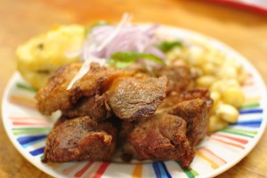 Because we had skipped lunch, we decided to order a dish as a snack to tide us over until dinner, and to coat our stomachs a bit for the chicha. The menu at the restaurant was pretty basic, which we were happy about because we had eaten too much rich food already on our trip. We decided to get an order of chicharron, which is deep fried chunks of pork. It was served on a plate with large corn kernels, potato, and raw red onion. The pork was a bit tough but it had crispy skin, which is always a plus. It wasn’t fancy or dressed up in any way, just the perfect food to soak up the chicha.