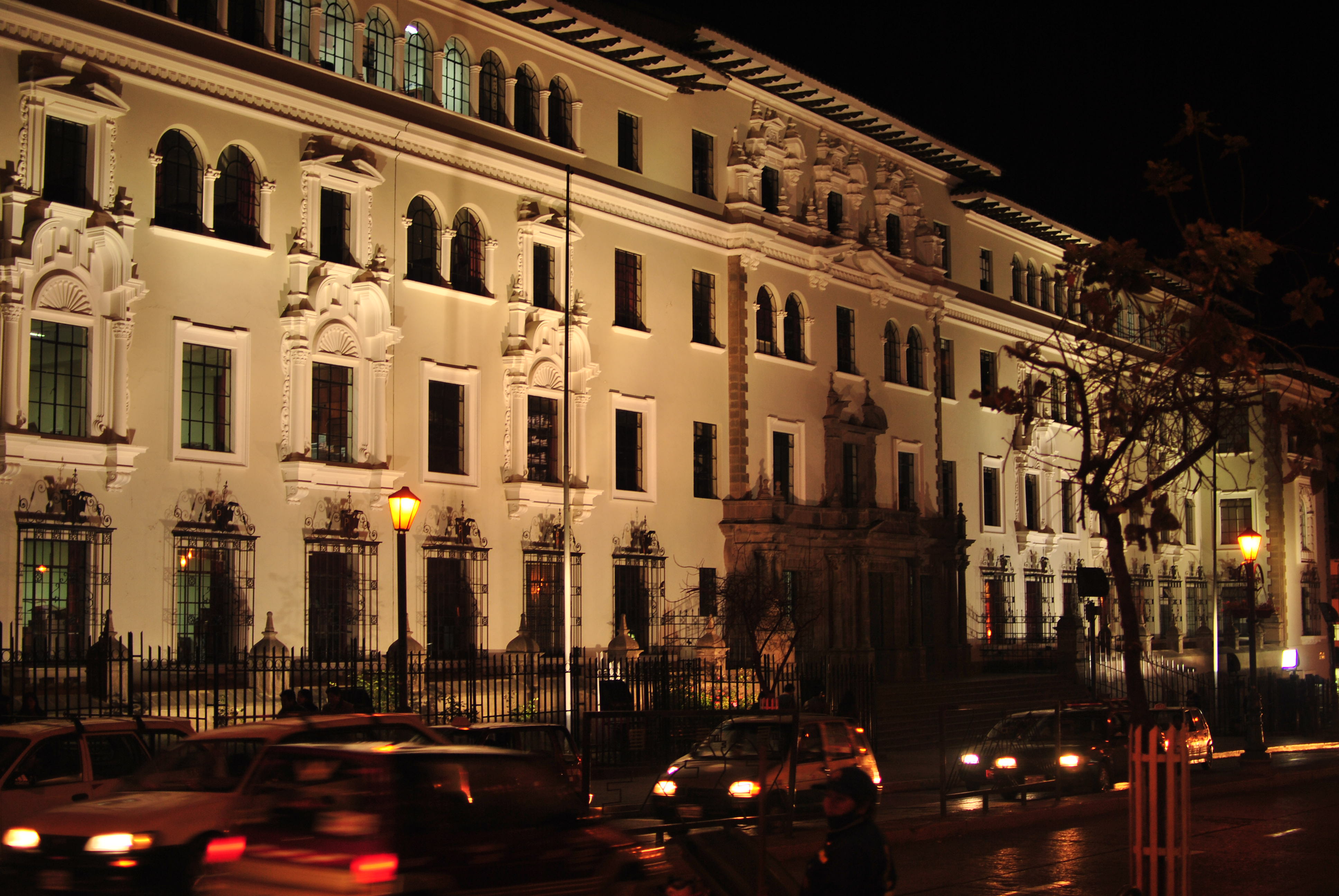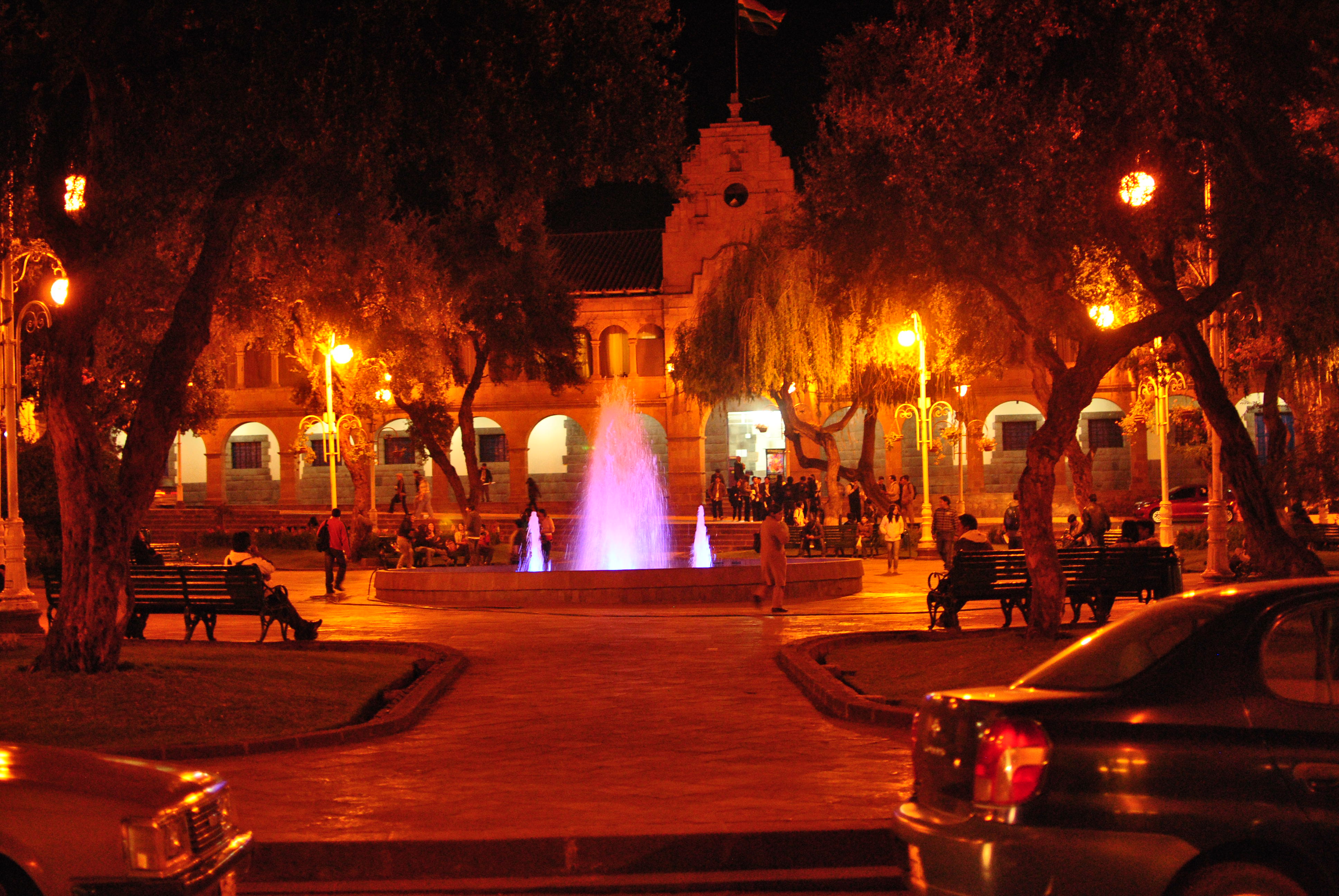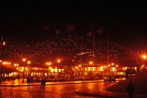 Plaza de Armas at night, with the lights of the surrounding hills in the background