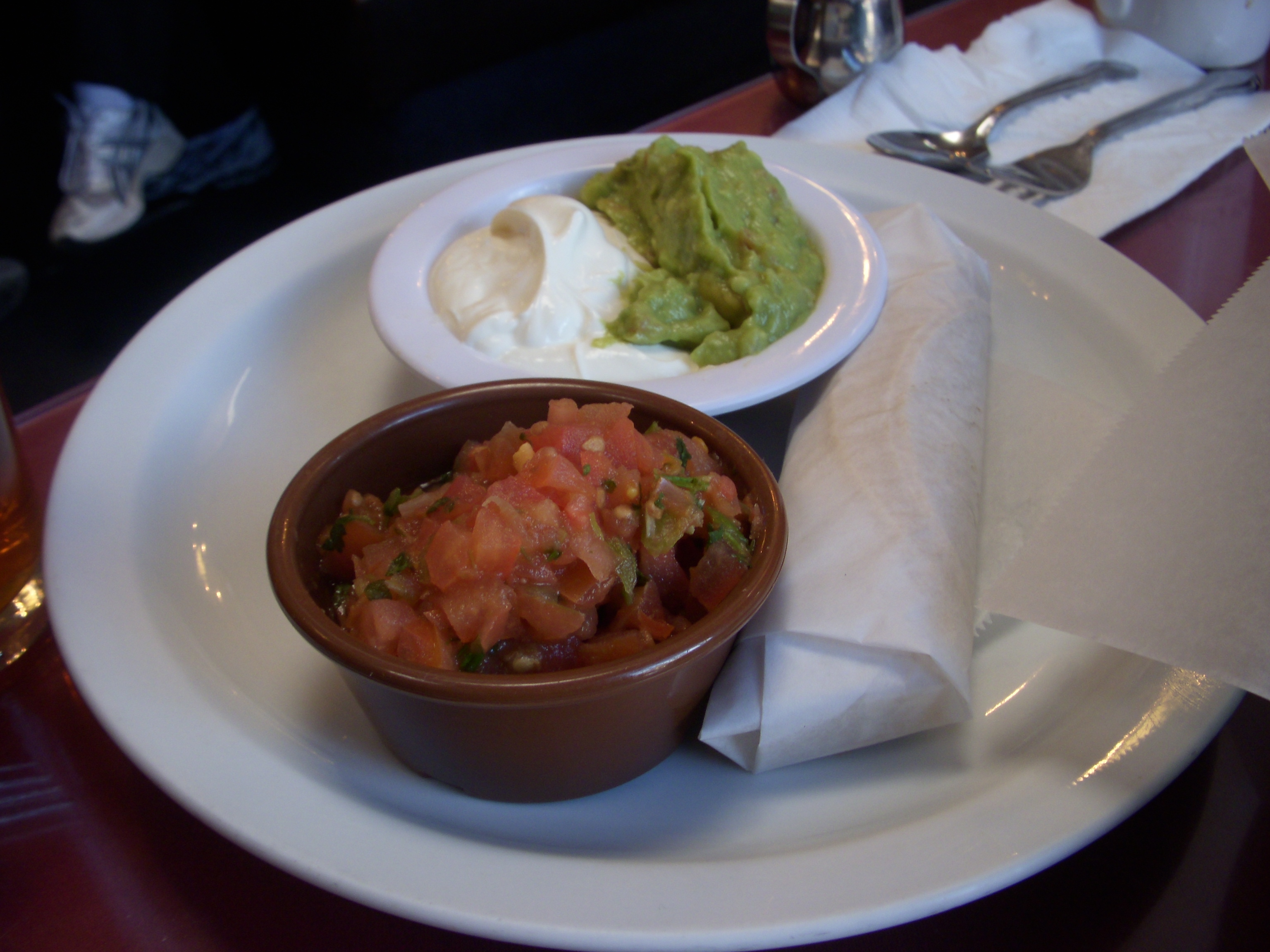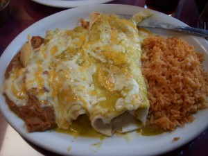 We also shared a Rio Grande plate, which included an enchilada verde, a chicken flauta, and a stuffed burrito. The enchilada was filled with chicken and covered in a tangy tomatilla sauce. The stuffed burrito was filled with beef picadillo and topped with melted cheese and ranchero sauce. The chicken flauta was in a crispy shell but on the dry side; it tasted better after dipping into the salsa they gave us with chips at the beginning of our meal. It was a large plate of food, rounded out with rice, beans, and guacamole salad. The enchilada verde was the star of the plate, with its nice and bright sauce.