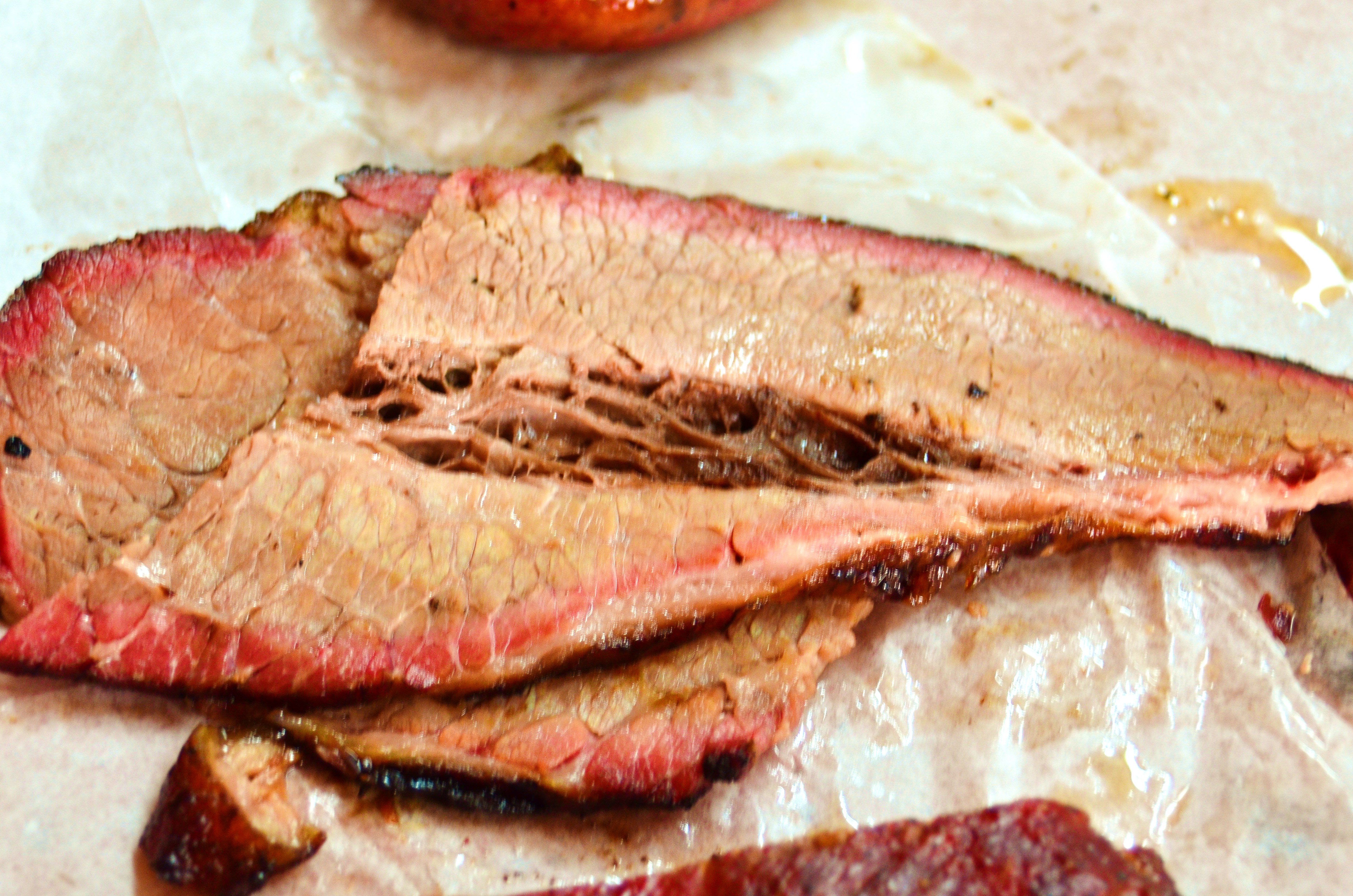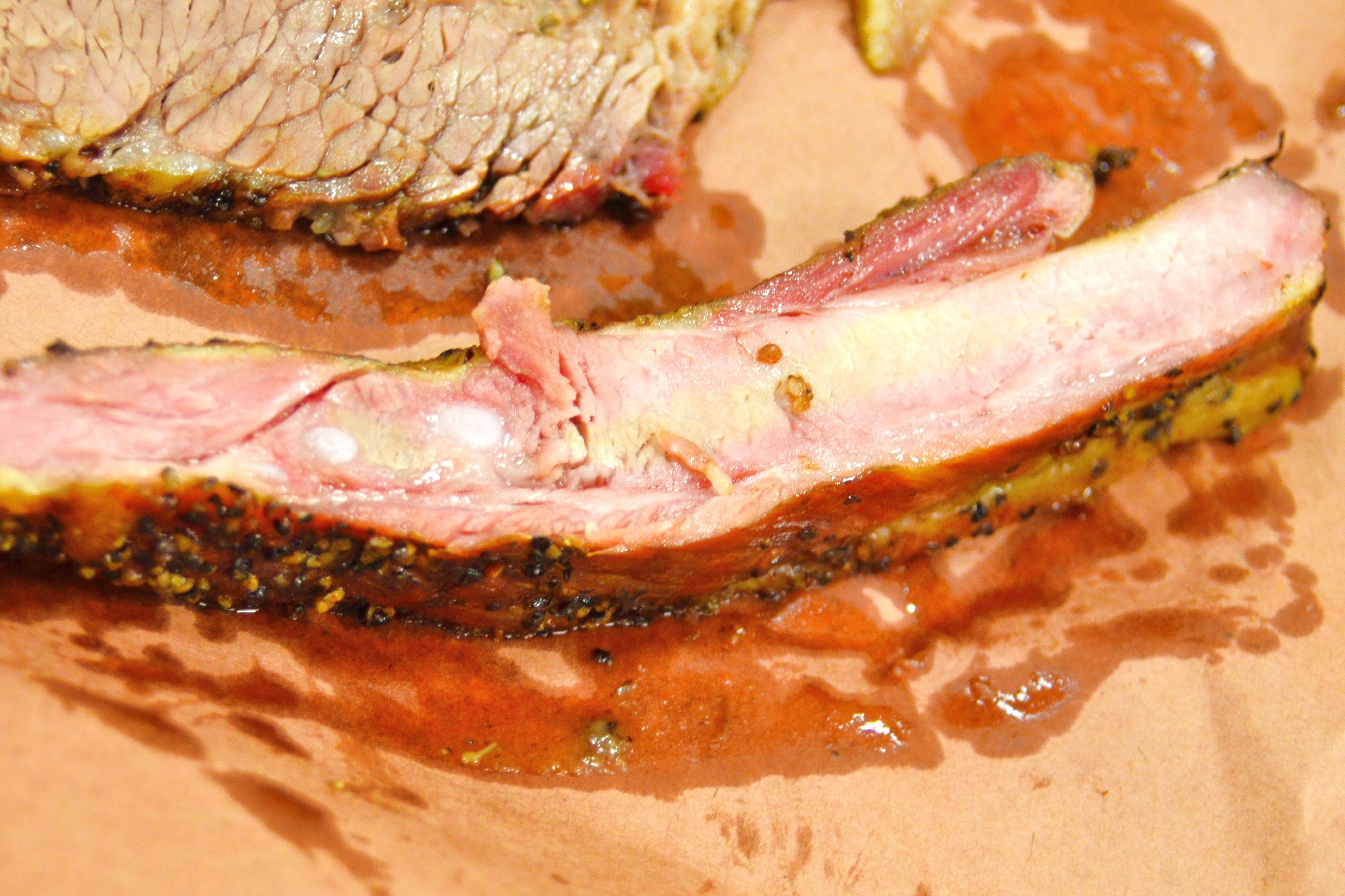 First we tried the brisket, which was astonishingly bland. It lacked both seasoning and smoke, and was much drier and tougher in texture than the other briskets we sampled. We tried using the salt and pepper mixture on it, but really, it just needed some sauce to add flavor and moisture.