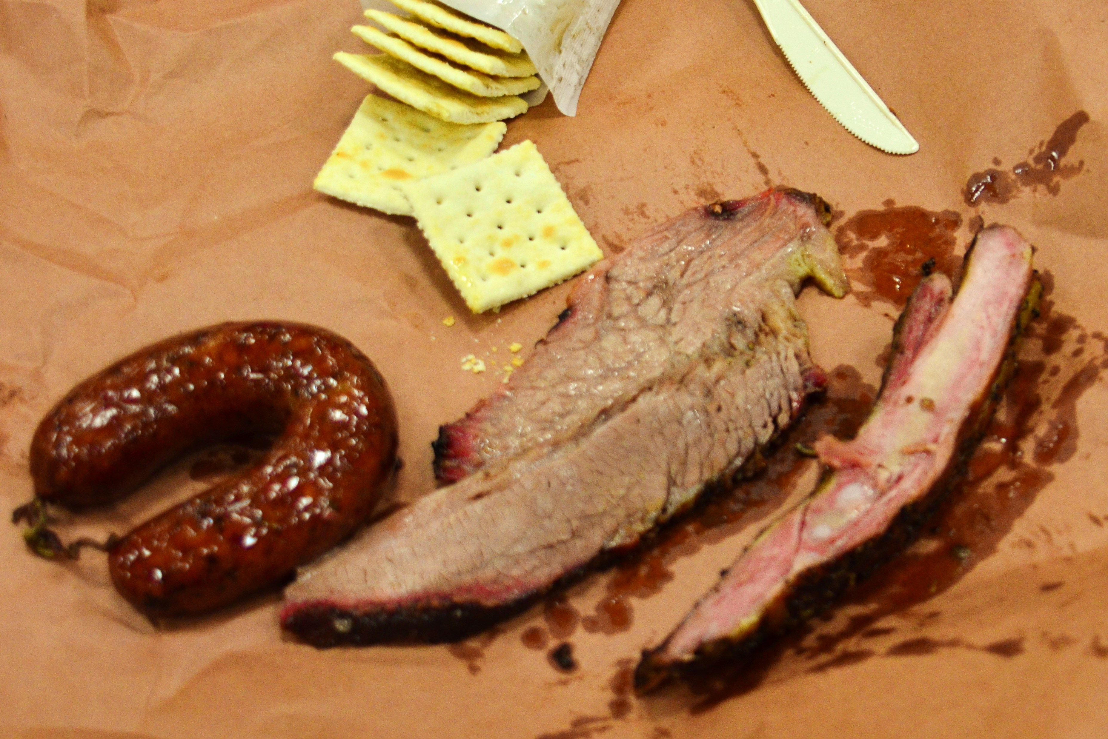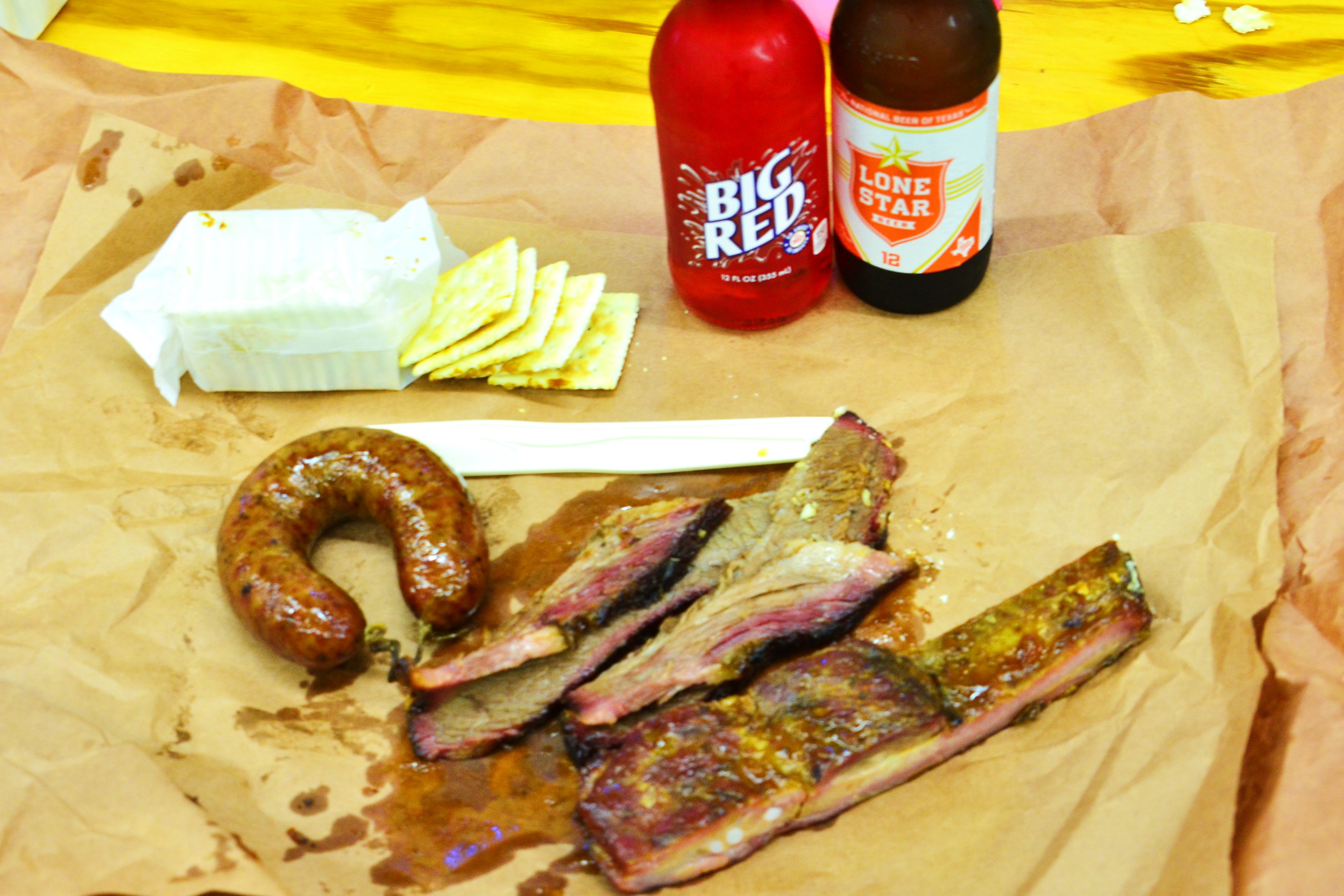 Josh went to get the food while I staked out some seats with J. He came back with the barbecue on butcher paper, more crackers for J, as well as a Big Red soda and Lone Star beer. Neither of us had ever tasted Big Red before, and to be perfectly honest, we both ended up hating it. It kind of tasted like cream soda, but not, and was just too sweet and cloying. The beer, however, was quite refreshing, and paired much better with the barbecue.