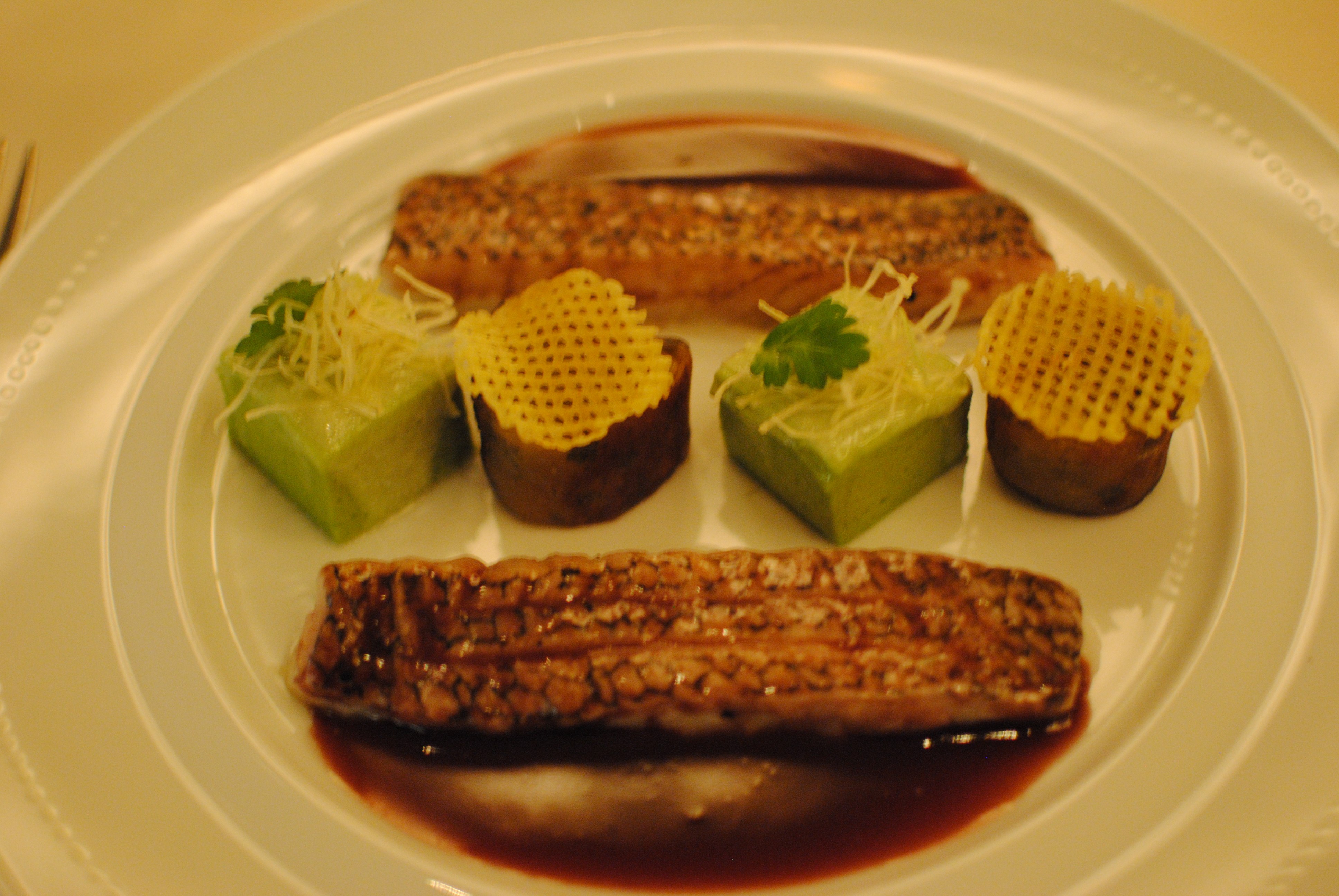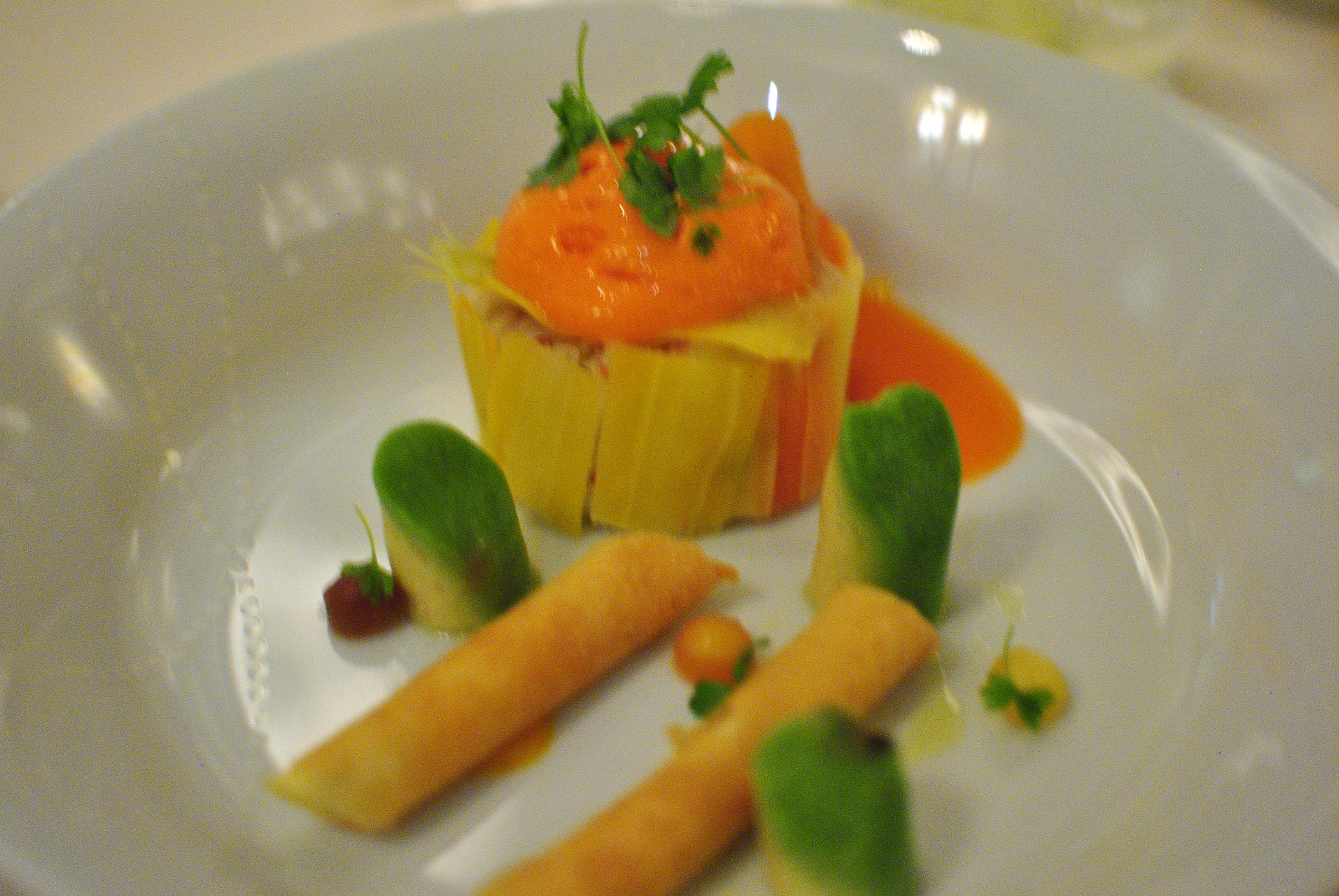 Chuck opted for the peekytoe crab salad with cumin carrot coulis, spanner crab craquelin, ginger, and avocado. The dish was beautifully presented, and he had nothing but nice things to say about the taste.