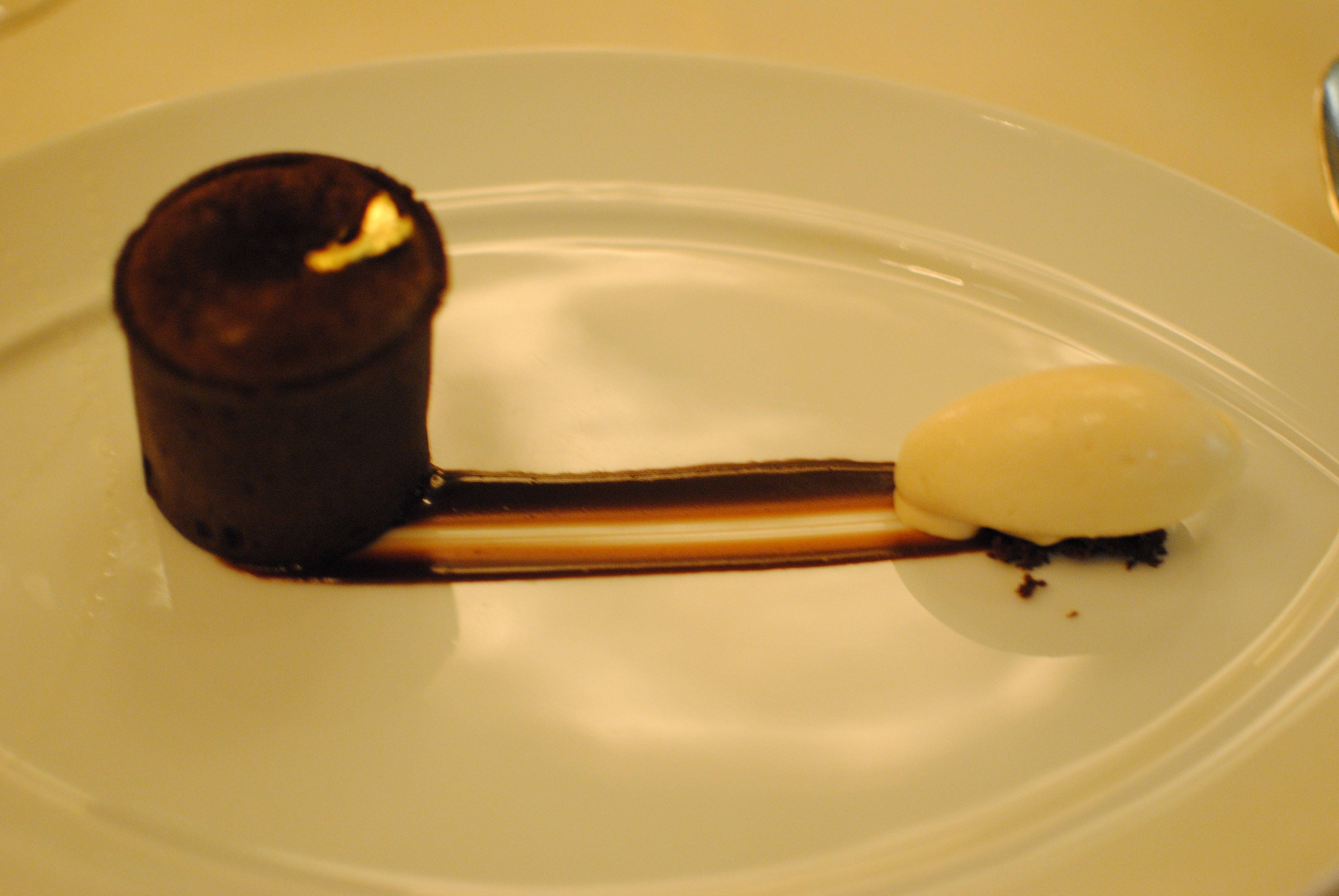For dessert, Chuck and Dave both selected the warm guanaja chocolate coulant with liquid caramel, fleur de sel, and milk sorbet. Again, a dish that Josh and I tried the first time, and another Daniel classic. While they both enjoyed the molten chocolate cake, they found it a tad rich and difficult to finish. Still, there were no major complaints.