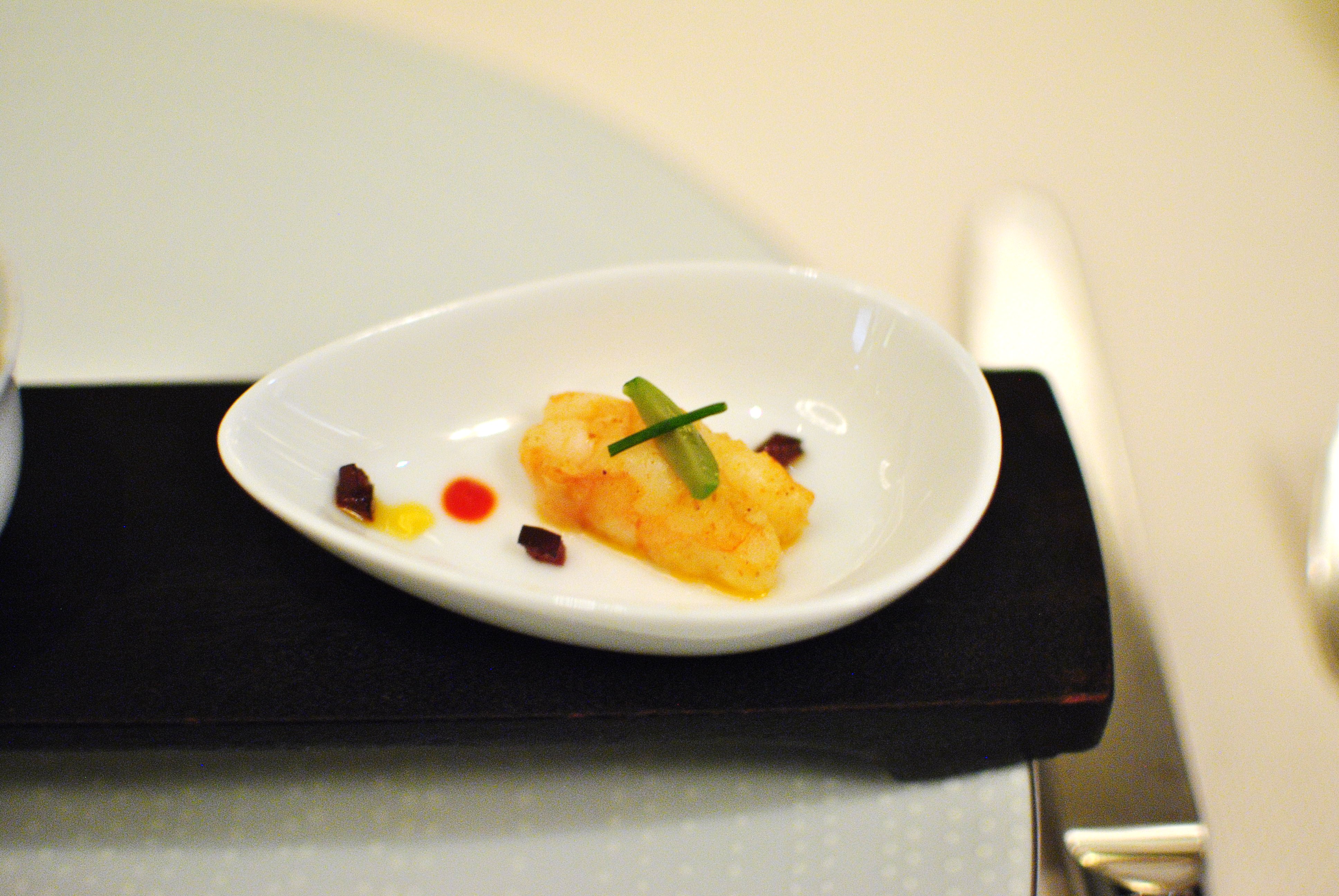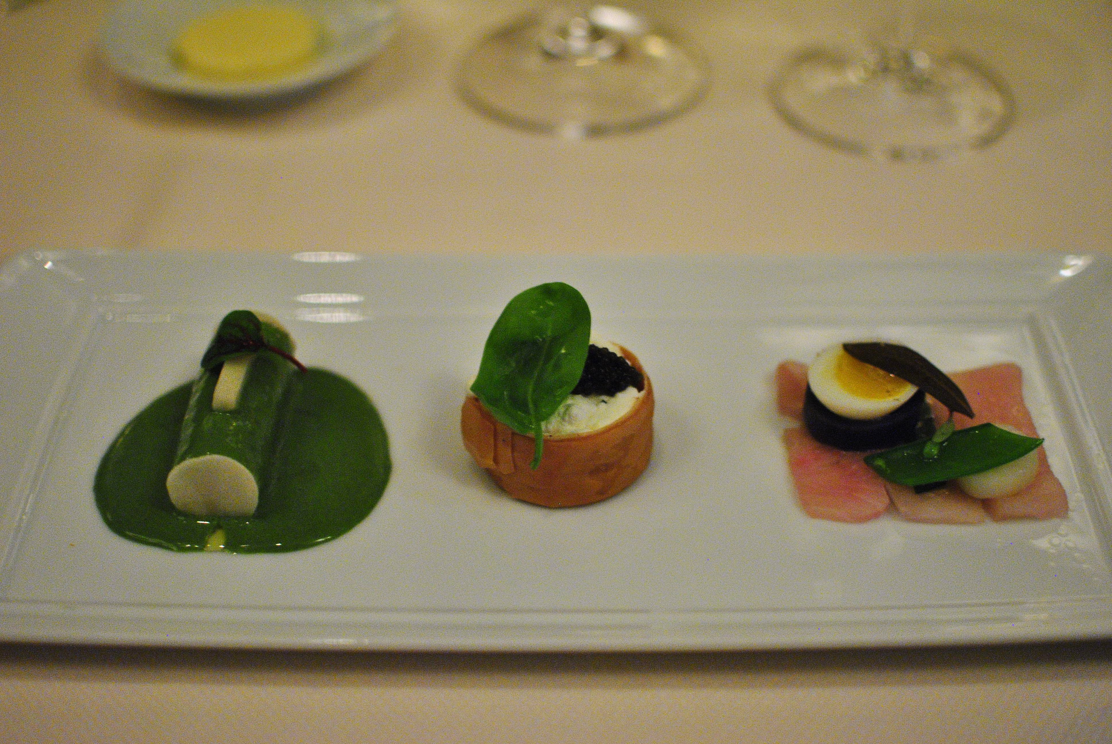 After we finished with the amuses, the bread man came by with a selection of assorted rolls and breads. I honed in on the butter roll, my favorite of the bunch, and a standard baguette. The butter roll is really just wonderful, with a nice crispy crust and a buttery inside that is flaky and chewy at the same time. The baguette also has a nice crust and good flavor.
