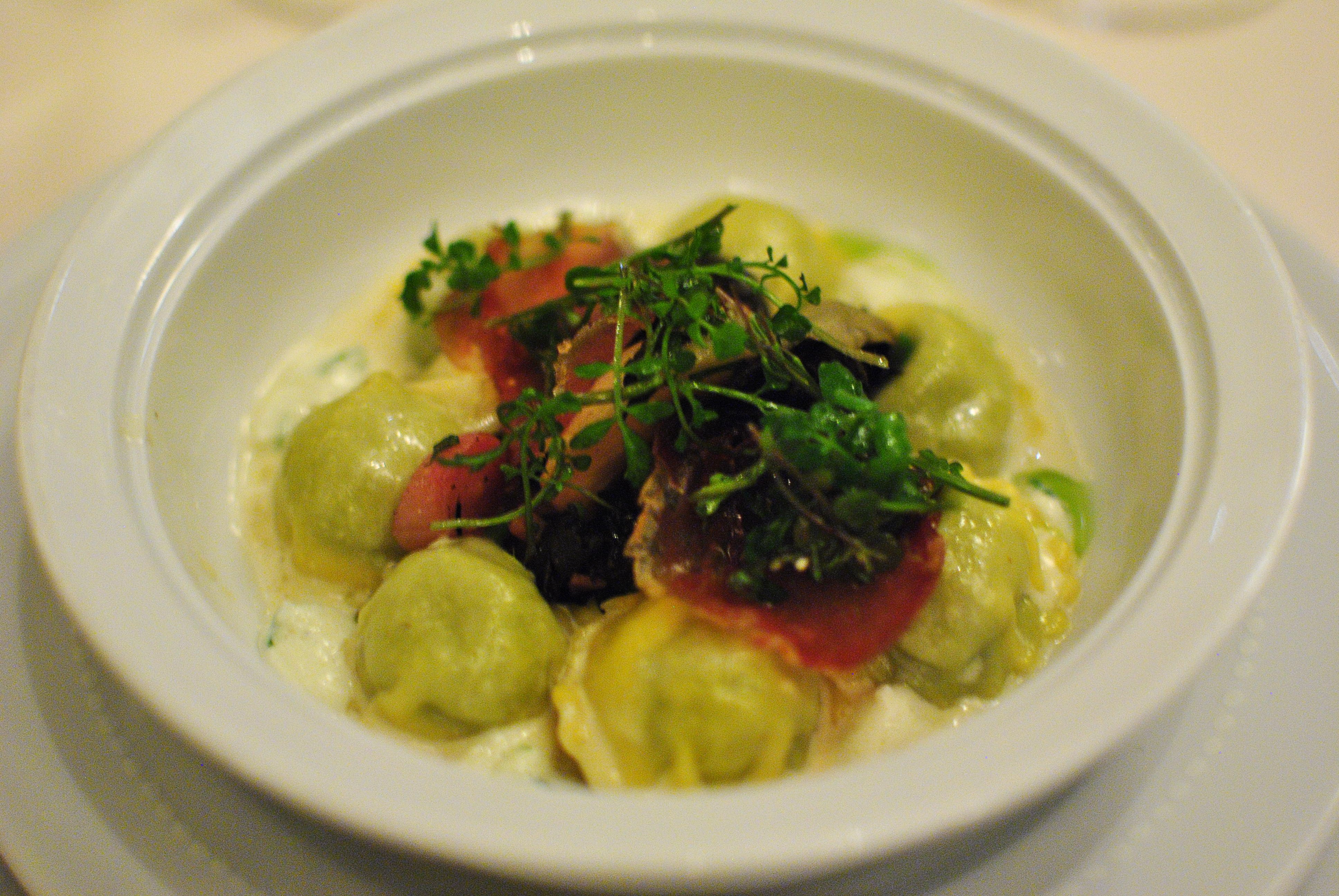 For the first course, I selected the trio of hamachi while Josh chose the wild herb ravioli with ricotta. We swapped plates midway through, per usual. The hamachi (yellowtail) featured three different preparations – confit with sorrel and hearts of palm, tartare with North Star caviar, and cured with bergamot (a type of orange) and snap peas.