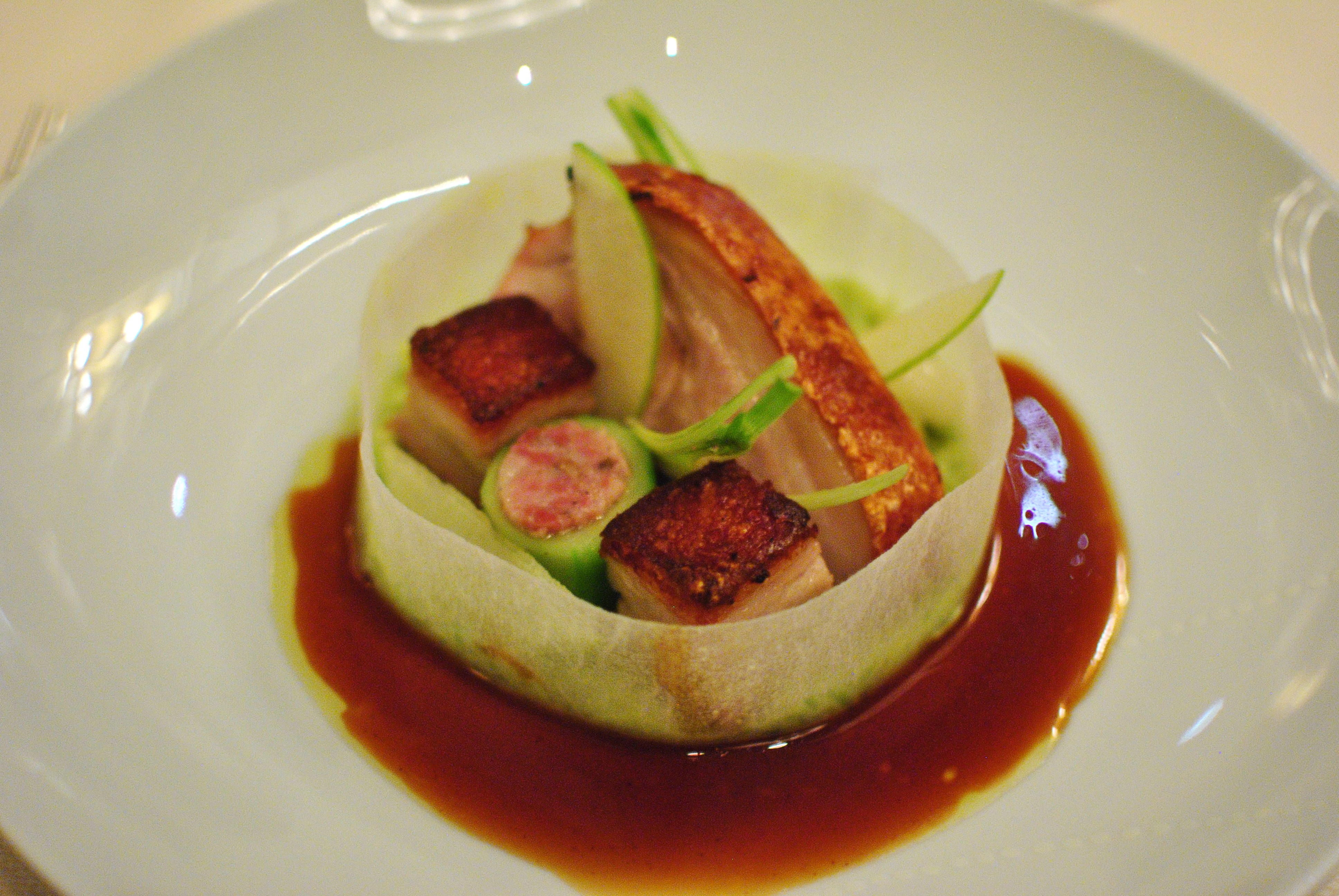 The trio of pig featured a roasted chop with glazed turnips, braised shoulder cannelloni with cucumber, and smoked ribs with fennel-avocado coleslaw and vadouvan jus. The presentation was stunning; it was almost a shame to tear into it, but we were eager to try all the different kinds of pork. The chop was tender and juicy, and it had super crispy skin surrounding it that was pretty incredible. It was like the best chicharron – flavorful and crunchy. The braised shoulder was stuffed inside a hollowed out piece of cucumber, which added a nice freshness to the rich pork. The pork itself was well seasoned, and it was an interesting combination. The smoked ribs were absolutely succulent, with a nice caramelized layer of fat on the outside. There were lots of different components to the dish but everything tasted great, both individually and together.