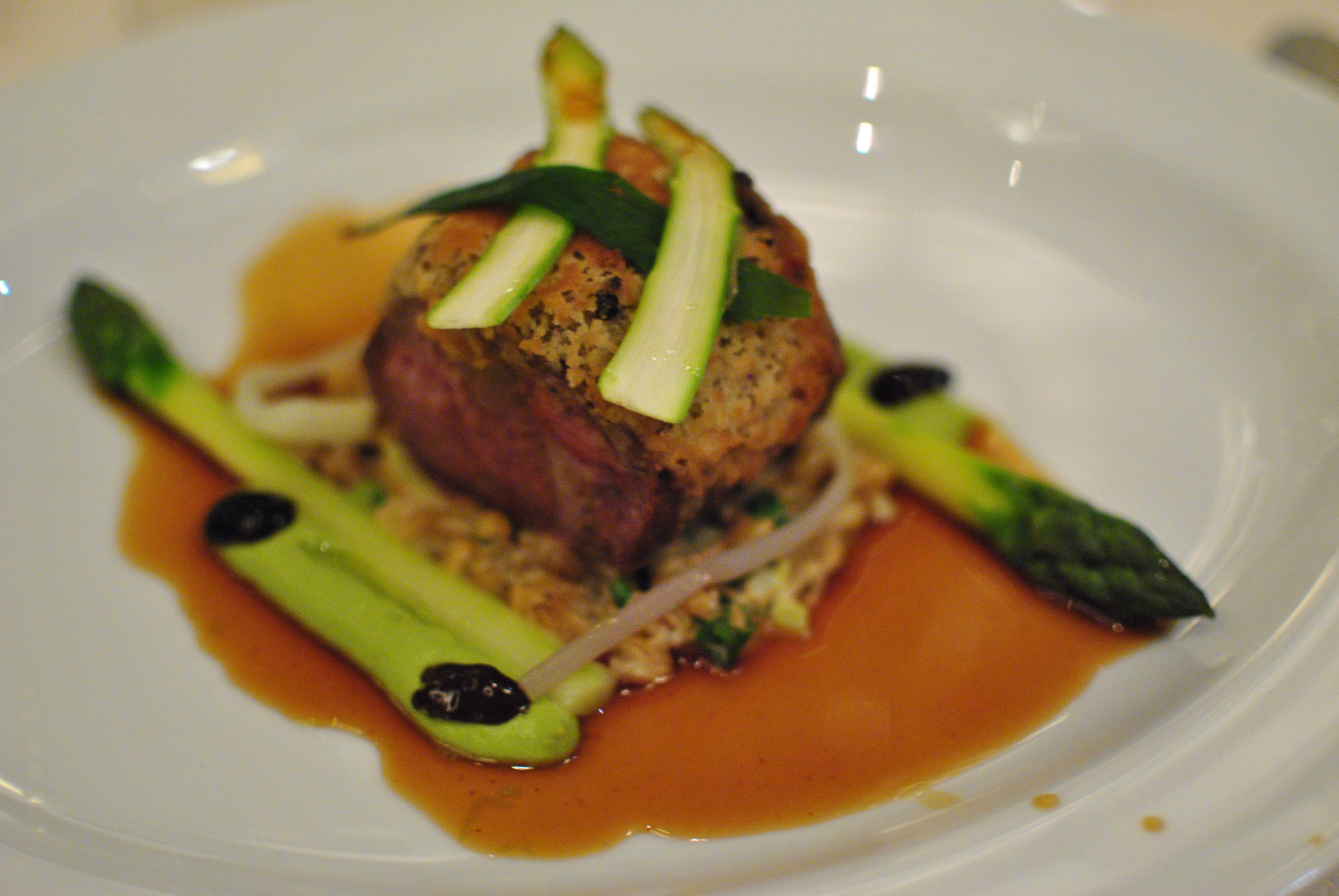 For the main course, Josh and I selected the lamb loin and the trio of milk fed pig from Quebec. The lamb loin, from Elysian Fields, was crusted with taggiasche olives and incredibly flavorful. The lamb had a nice gamey flavor, and though it was a bit past the requested medium rare, it was still tender and juicy. The lamb was served with asparagus, ramps, and a kamut berry ragout that had a wonderfully chewy texture to it and a nice nutty flavor. I really enjoyed this dish and thought it was well balanced – not too heavy or rich.