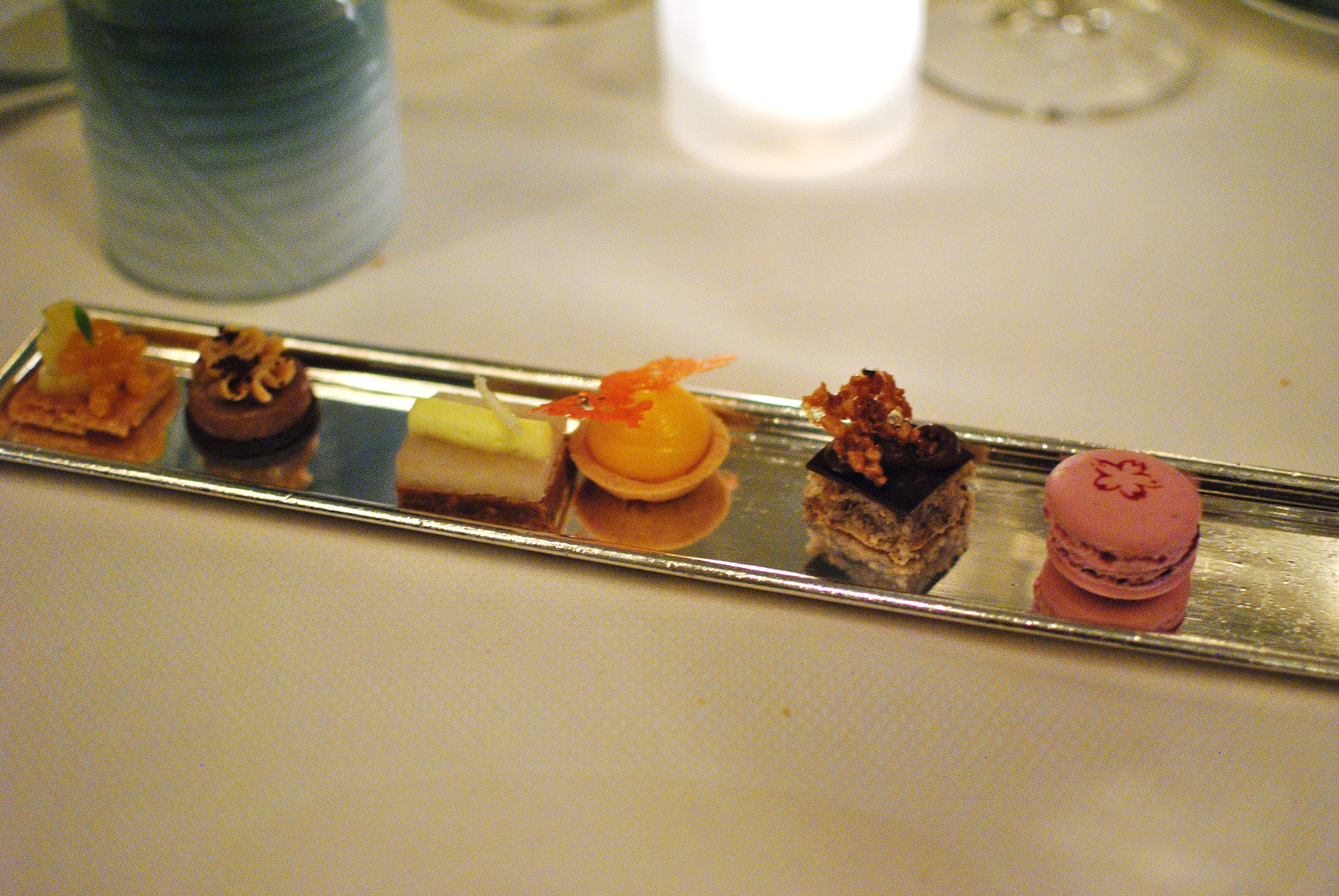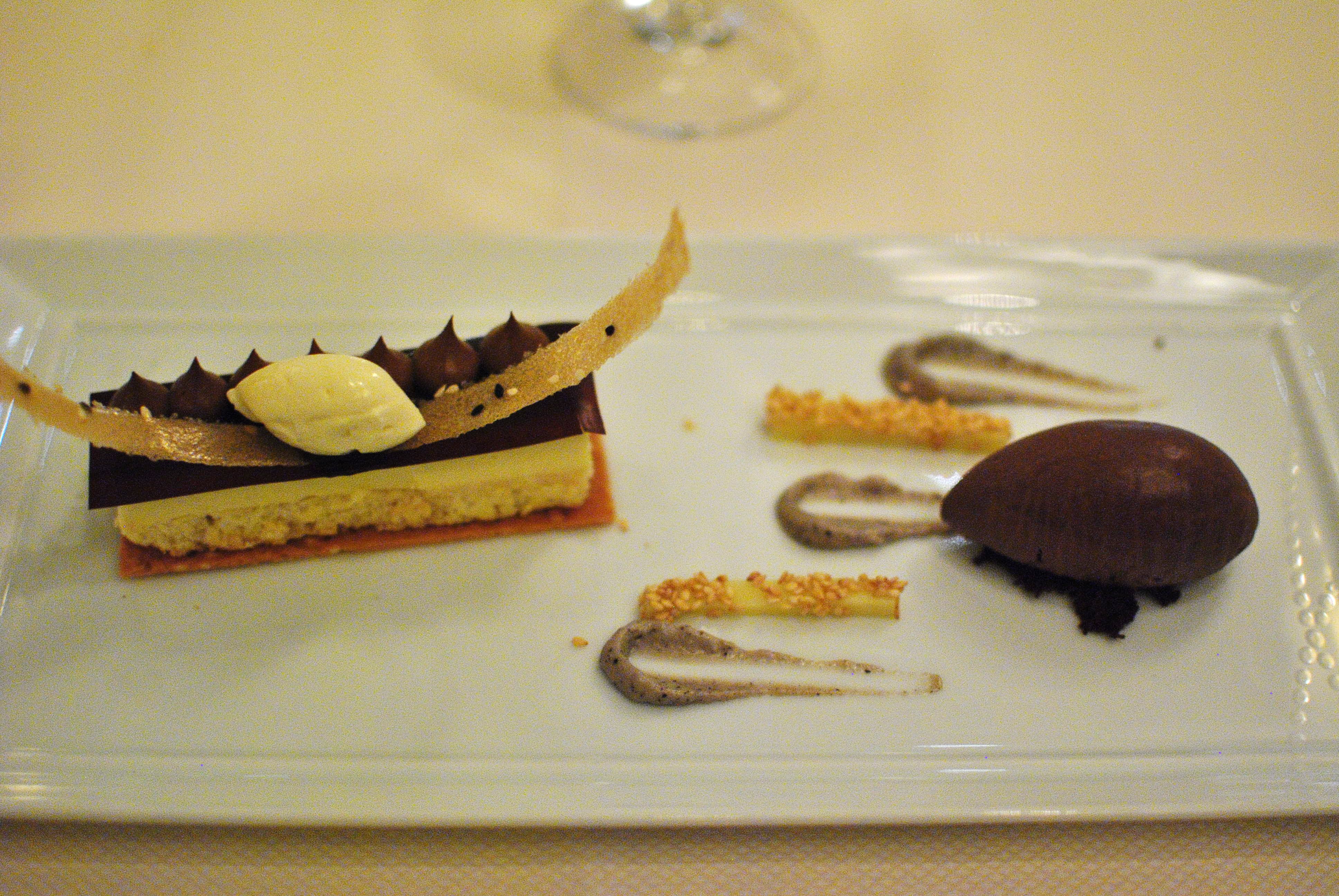 The sesame bavaroise and araguani chocolate cremeux was a much richer dessert, with lots of toasted sesame flavor. Sesame is kind of nutty, which pairs well with chocolate. There was also a szechuan pepper gelee on the plate, though I don’t really remember tasting it, and chocolate ice cream. It was an interesting dessert with an unusual flavor combination, but you really have to like sesame to enjoy it.