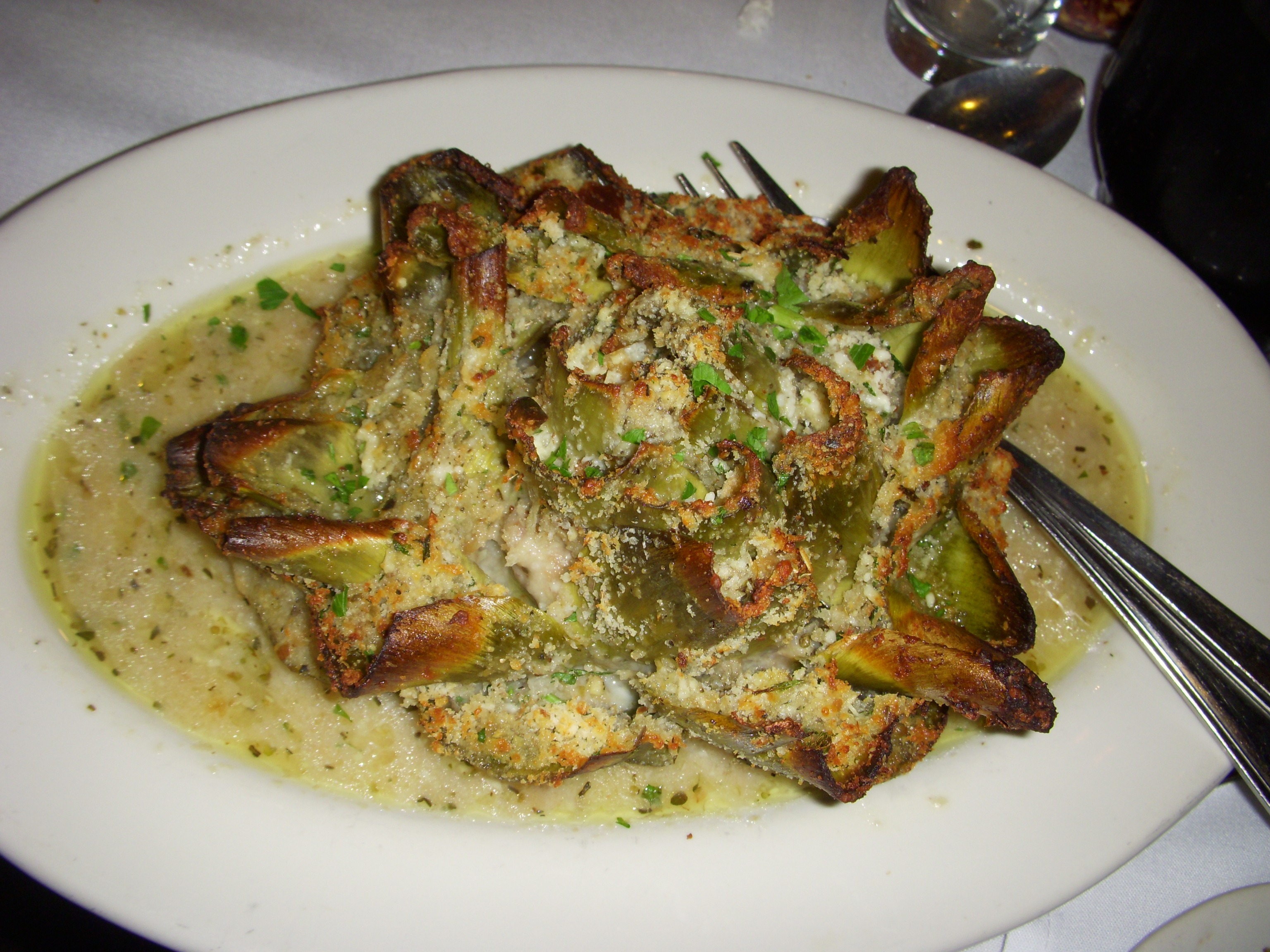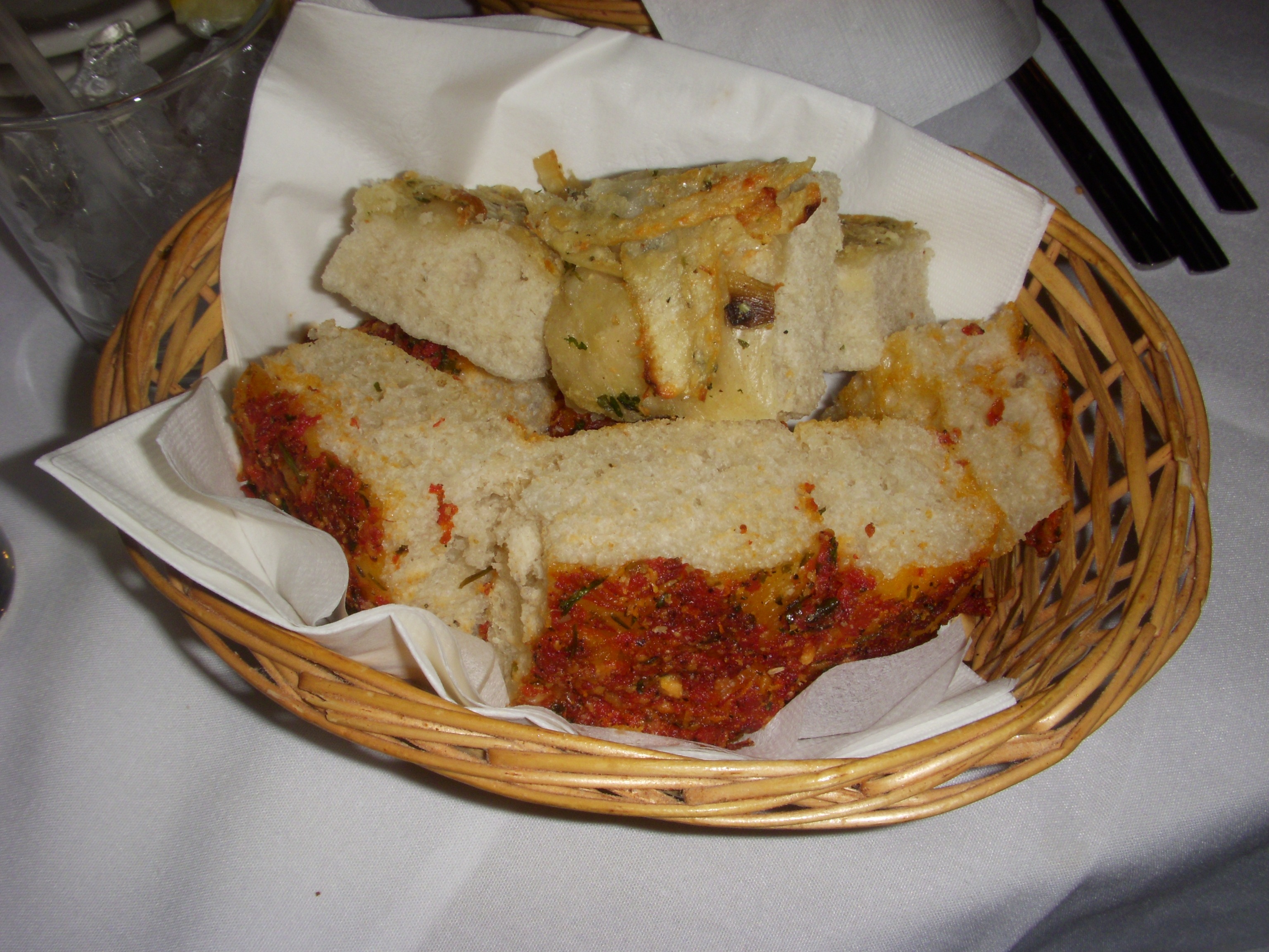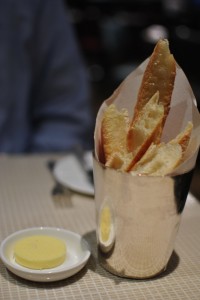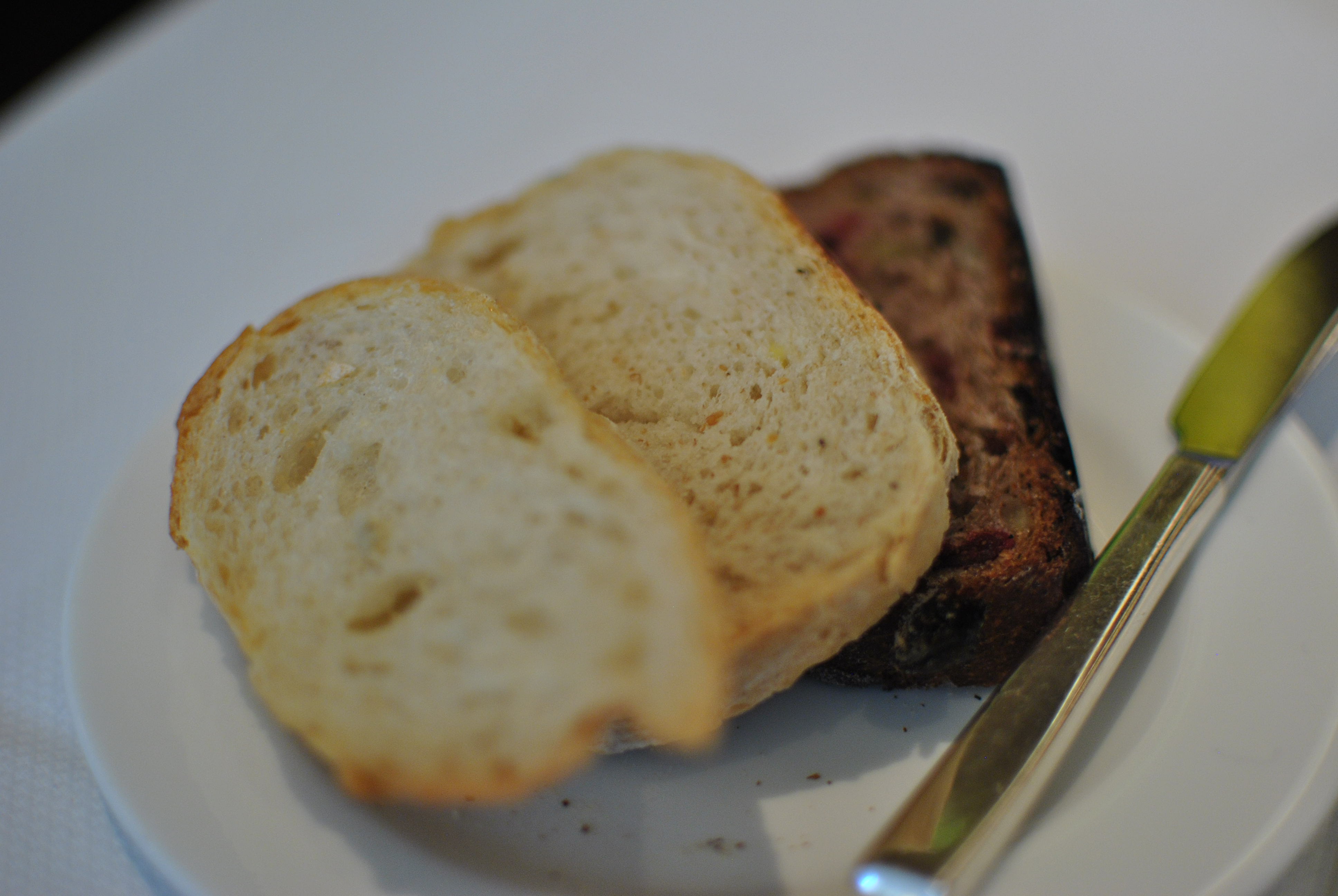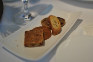 After we made our selections, we settled in to enjoy our meal. First up was the bread, which featured an olive rosemary stick, a crusty white roll, and I think a whole wheat roll (sorry, my memory is fuzzy). The star of the lineup was definitely the olive rosemary stick, which was studded with salty and briny green olives.