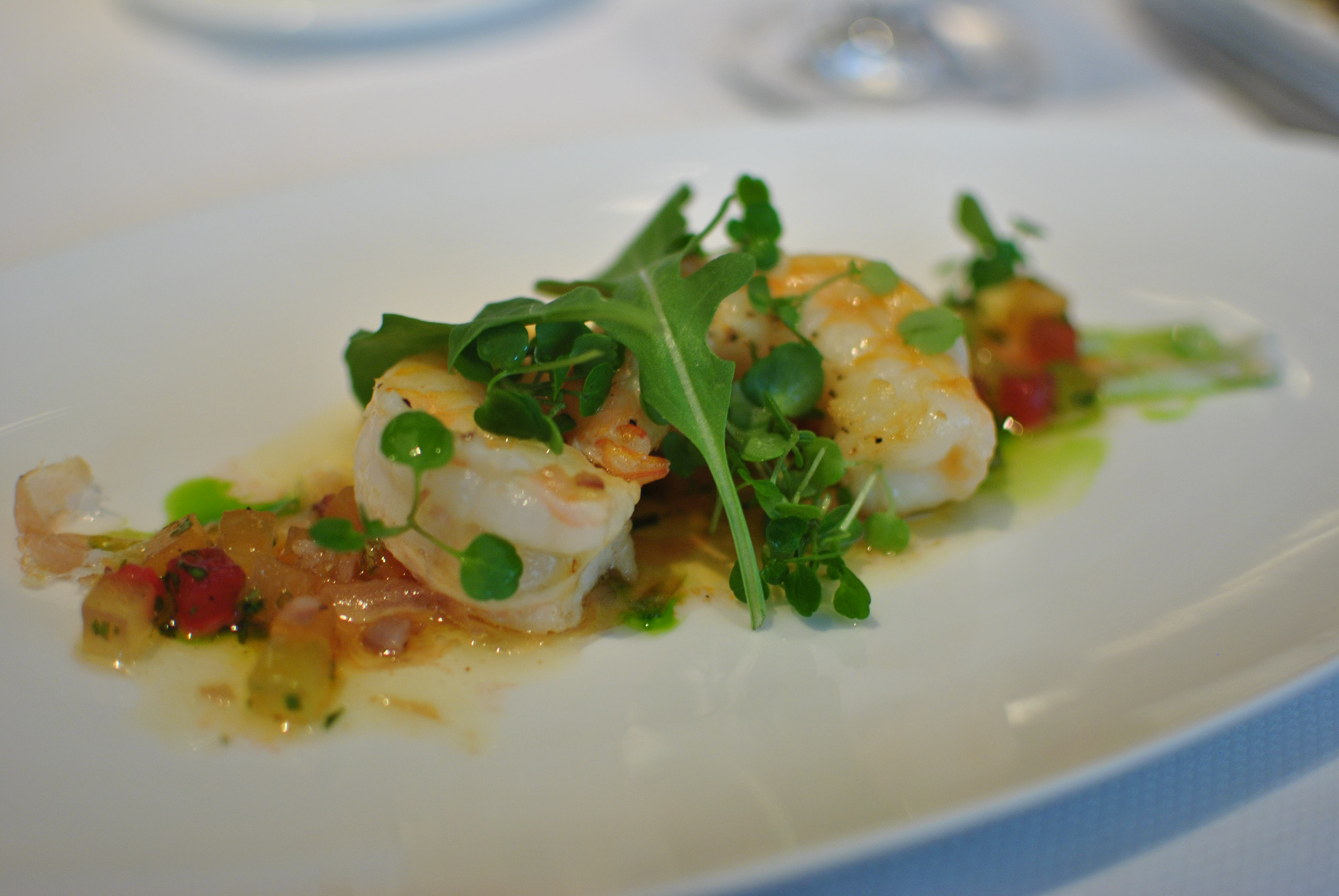 The second course of the prix fixe comes from a category called “Barely Touched.” Again, we all picked the dish that we wanted for the course, split it into thirds, then passed it along so that everyone could have a taste. We selected the peekytoe “crab cake,” the smoked yellowfin tuna “prosciutto,” and the seared langoustine. The peekytoe crab was a pile of loosely packed crab meat served with mango ribbons and a chili crab broth. There was no filler in this “crab cake,” just crab meat. The broth was pretty complex, with lots of different spices. It definitely had an Asian flavor to it, and we actually requested spoons so that we could spoon up the broth to eat together with the crab meat. Josh really enjoyed this dish a lot.