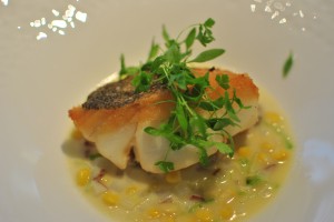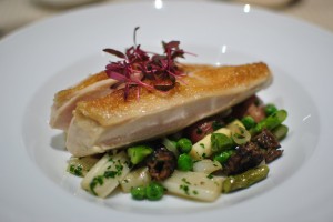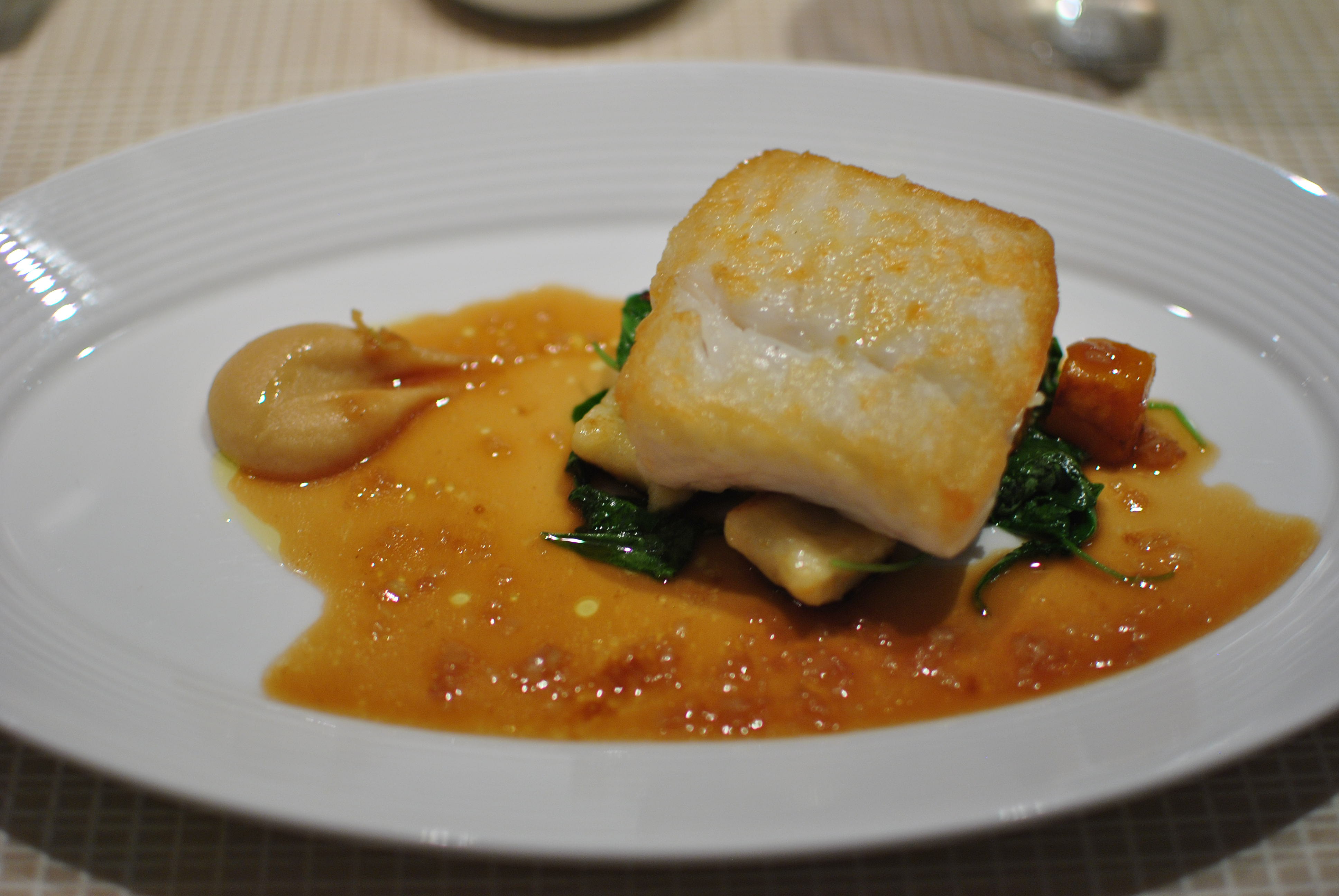 The third course, our last savory course, came from the “Lightly Cooked” category. We wound up selecting the poached halibut, the sauteed codfish, and the baked skate and langoustine “paupiette.” The halibut was described as being served with braised artichokes stuffed with water chestnuts and bacon in a Persian lime scented truffle broth. I have to admit, we picked the dish because of the lime scented truffle broth and were disappointed with what we actually received. The broth had no trace of truffle flavor, nor was it tangy from the Persian lime as we had anticipated. The broth was still flavorful, just not what we expected based on the description. I did like the stuffed artichokes, and the halibut itself was tender and flaky.