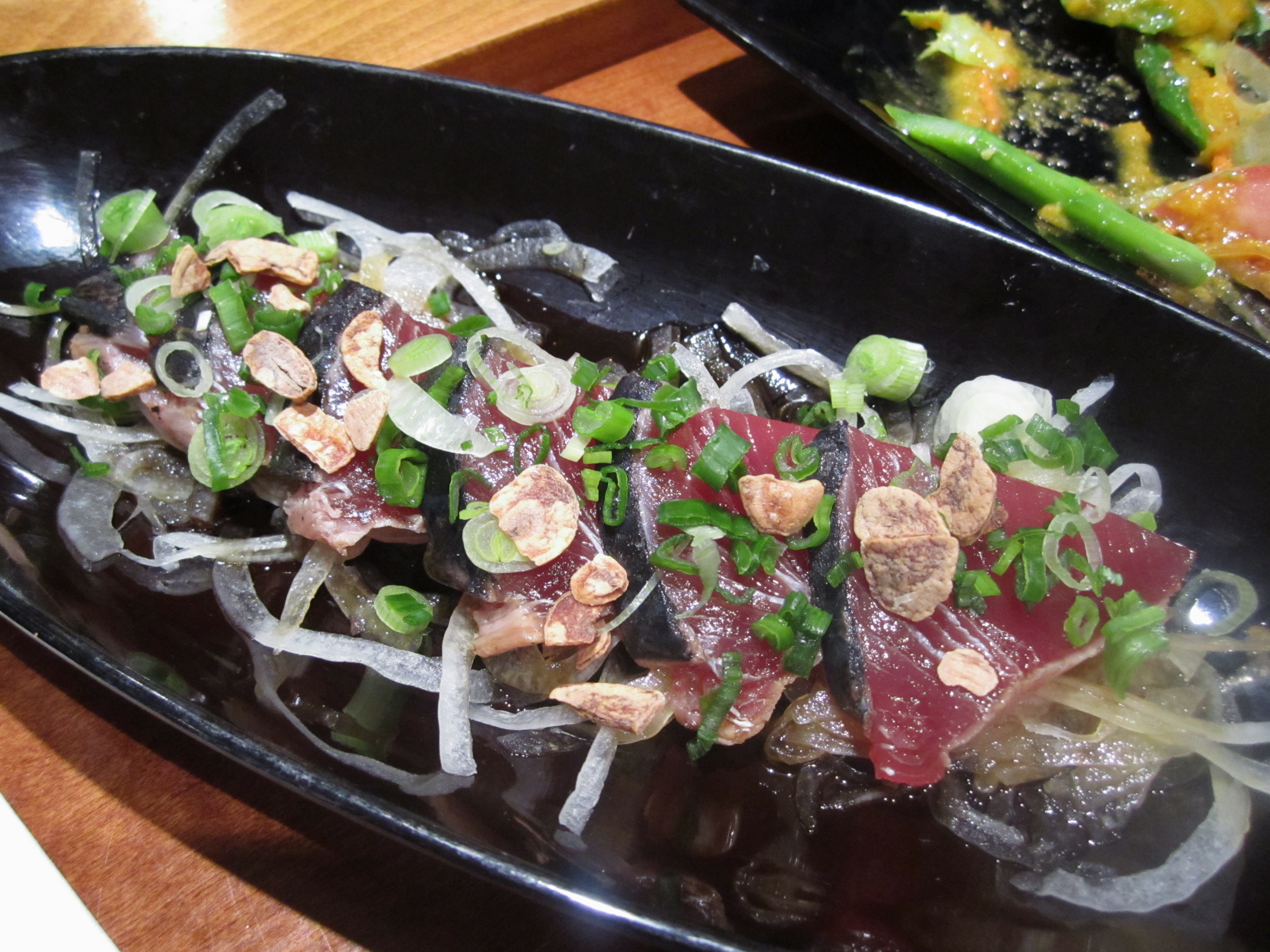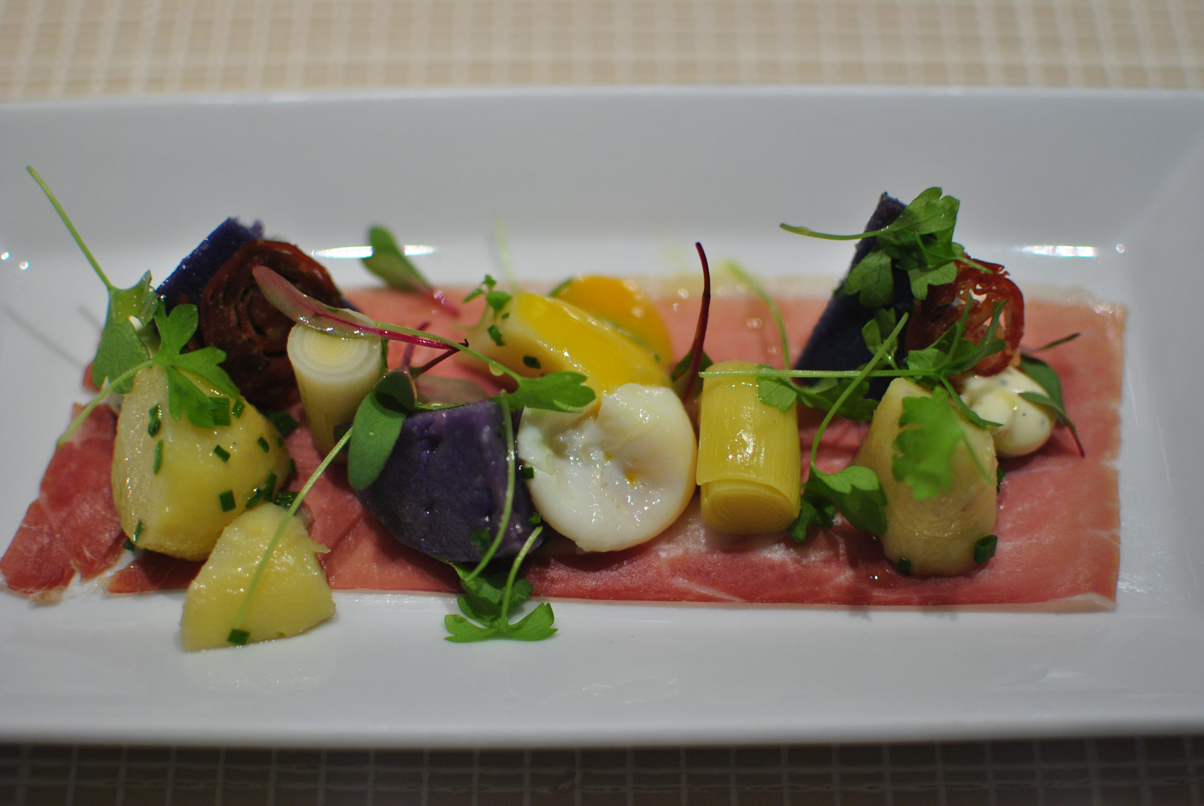 The smoked yellowfin tuna “prosciutto” was an interesting dish, with thick pieces of tuna that were a deep red color and had a salty, smoky flavor to it. The tuna was topped with pieces of pickled vegetables and a crispy sheet of kombu seaweed. I didn’t love the flavor of the tuna but I appreciated the whimsical aspect behind the dish.