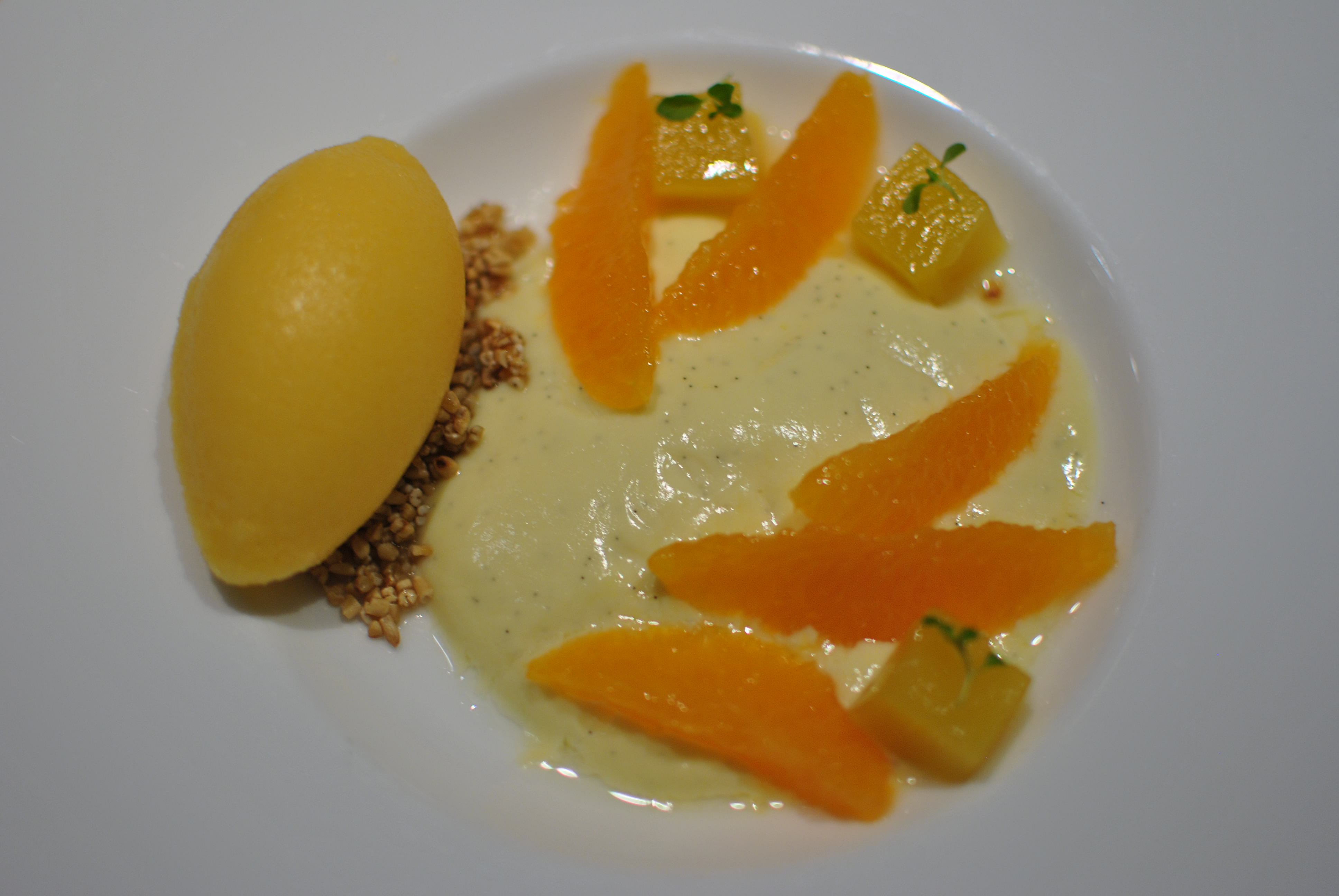 We did order two other desserts for our prix fixe, the pistachio and the citrus. The pistachio featured pistachio mousse, vanilla cream, lemon raspberry pearls, and pistachio ice cream. I’m a huge fan of pistachio so I loved this dessert as well. I felt bad though when I found out later that Melissa doesn’t really like pistachio. Still, the mousse was light and airy while the ice cream was dense and rich. Pistachio was definitely the dominating flavor on the plate. The lemon raspberry pearls added a bit of color and some whimsy to the dish.