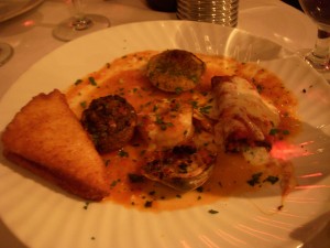 As usual, Josh and I went halfsies on our meal, although we had to be careful about picking items that I could eat. We started off with seared scallops and crab salad for our appetizer course. The seared scallops were served with golden raisins, almonds, and maple-lemon butter. While the scallops were cooked perfectly, I found the dish to be entirely too sweet. To me, the sauce was a bit sticky and cloying, and I didn’t love the combination with the raisins. Josh, on the other hand, loved the dish, and found it to be well balanced and flavorful. It just goes to show that we don’t always have the same tastes!