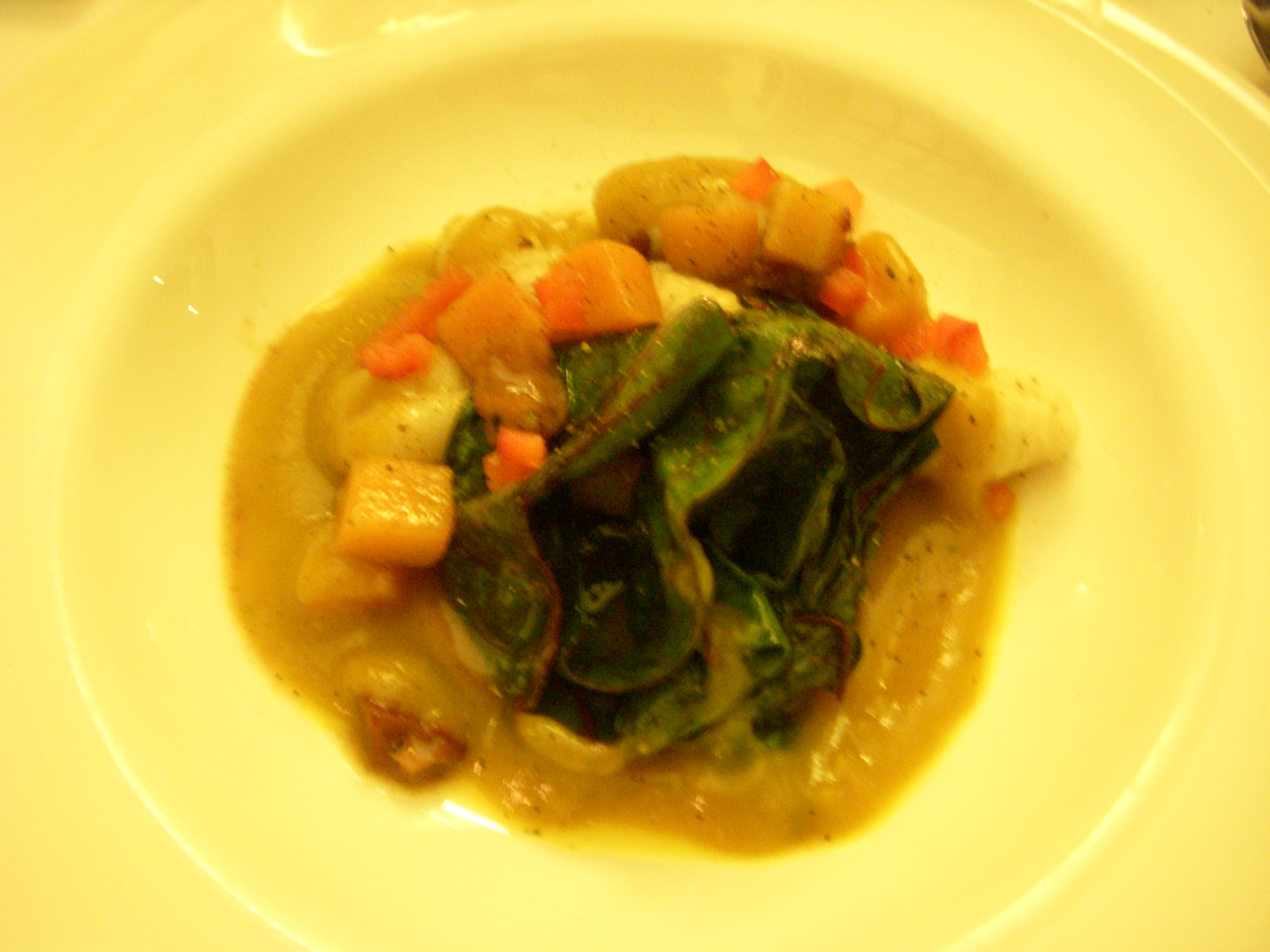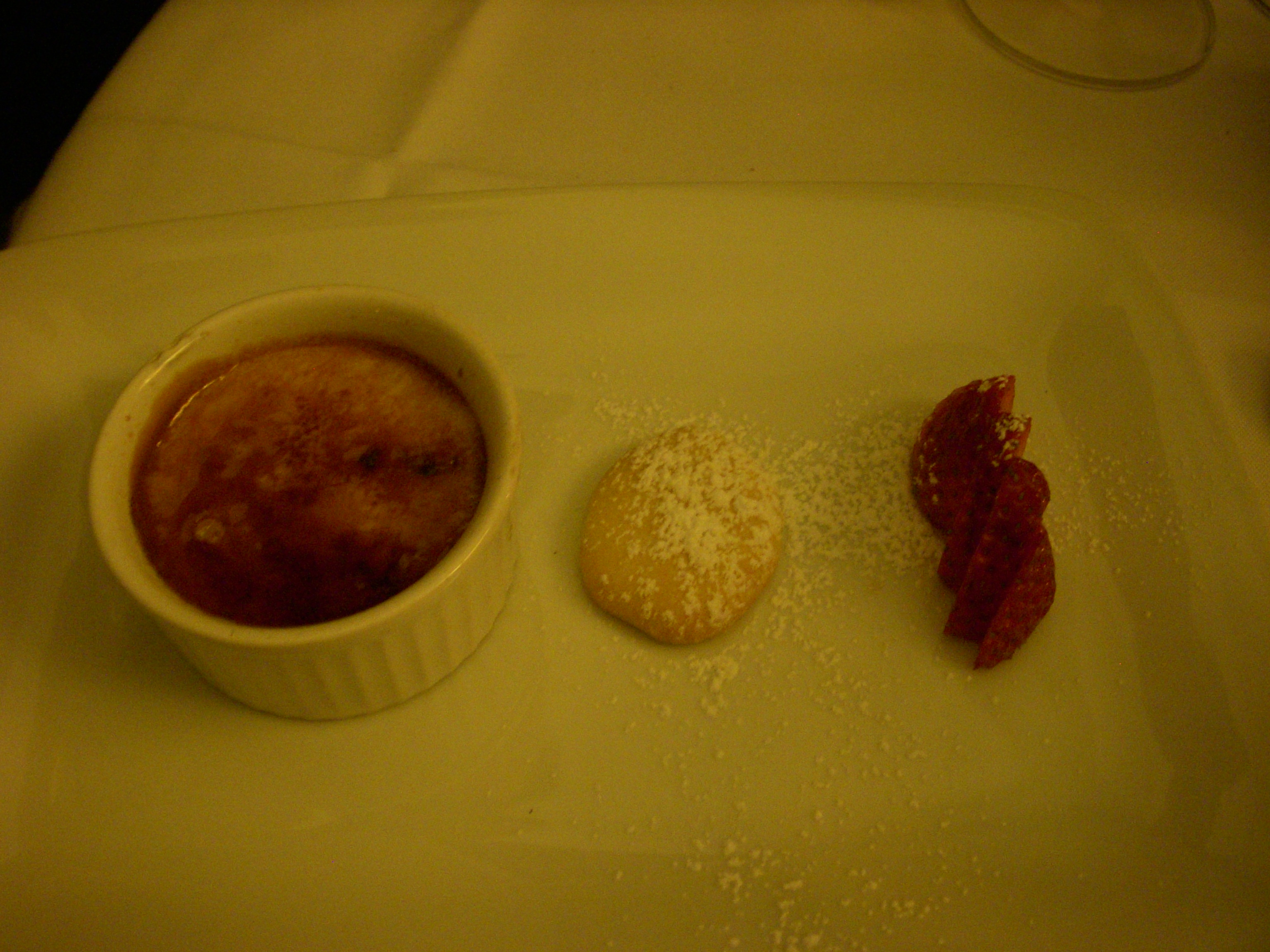 Chocolate cake with vanilla sauce, which was billed as one of the “Cooking Light” options, tasted as such. It was neither chocolately nor satisfying.