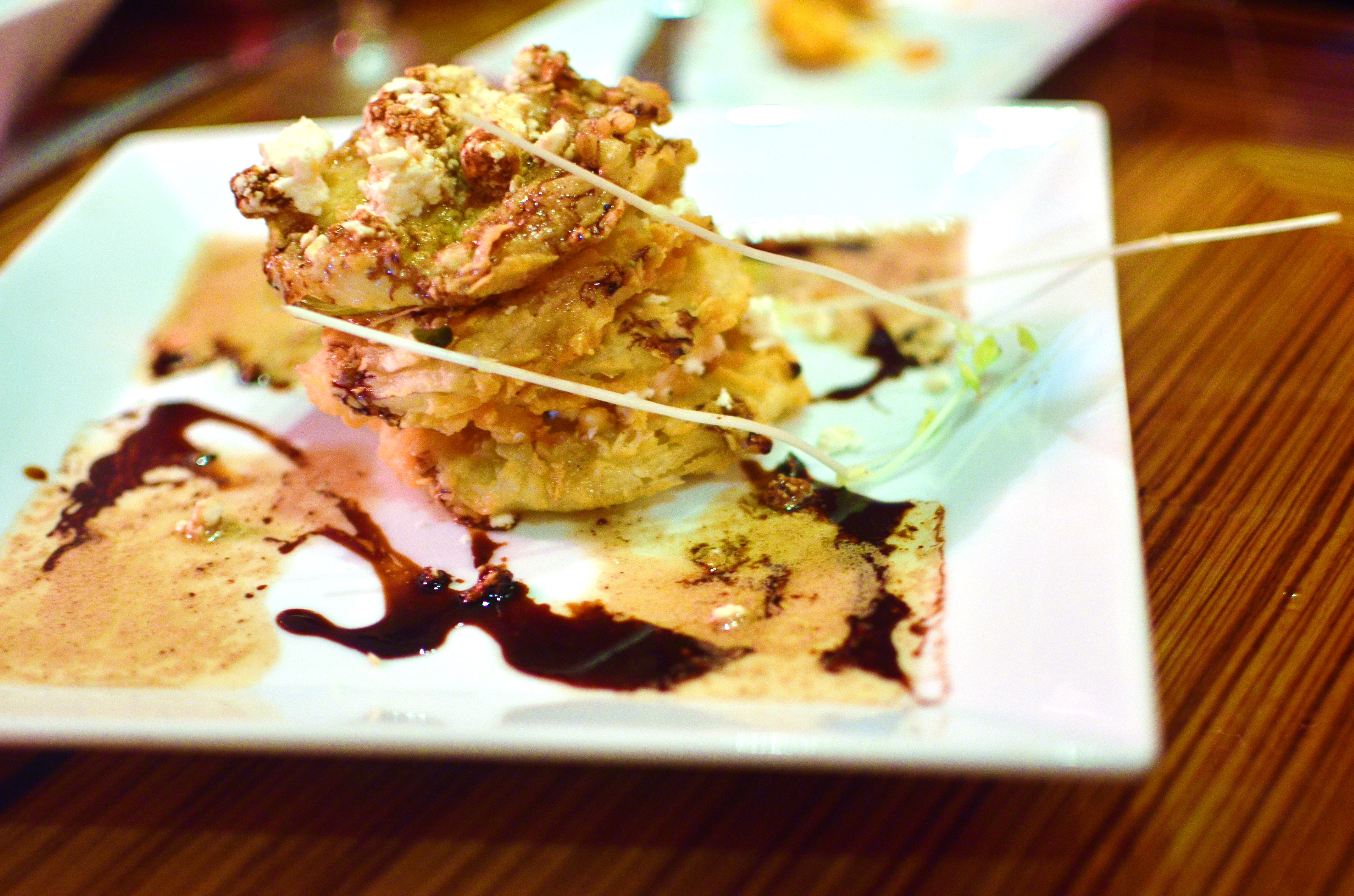 Fried green tomatoes with brown butter, feta cheese, and balsamic