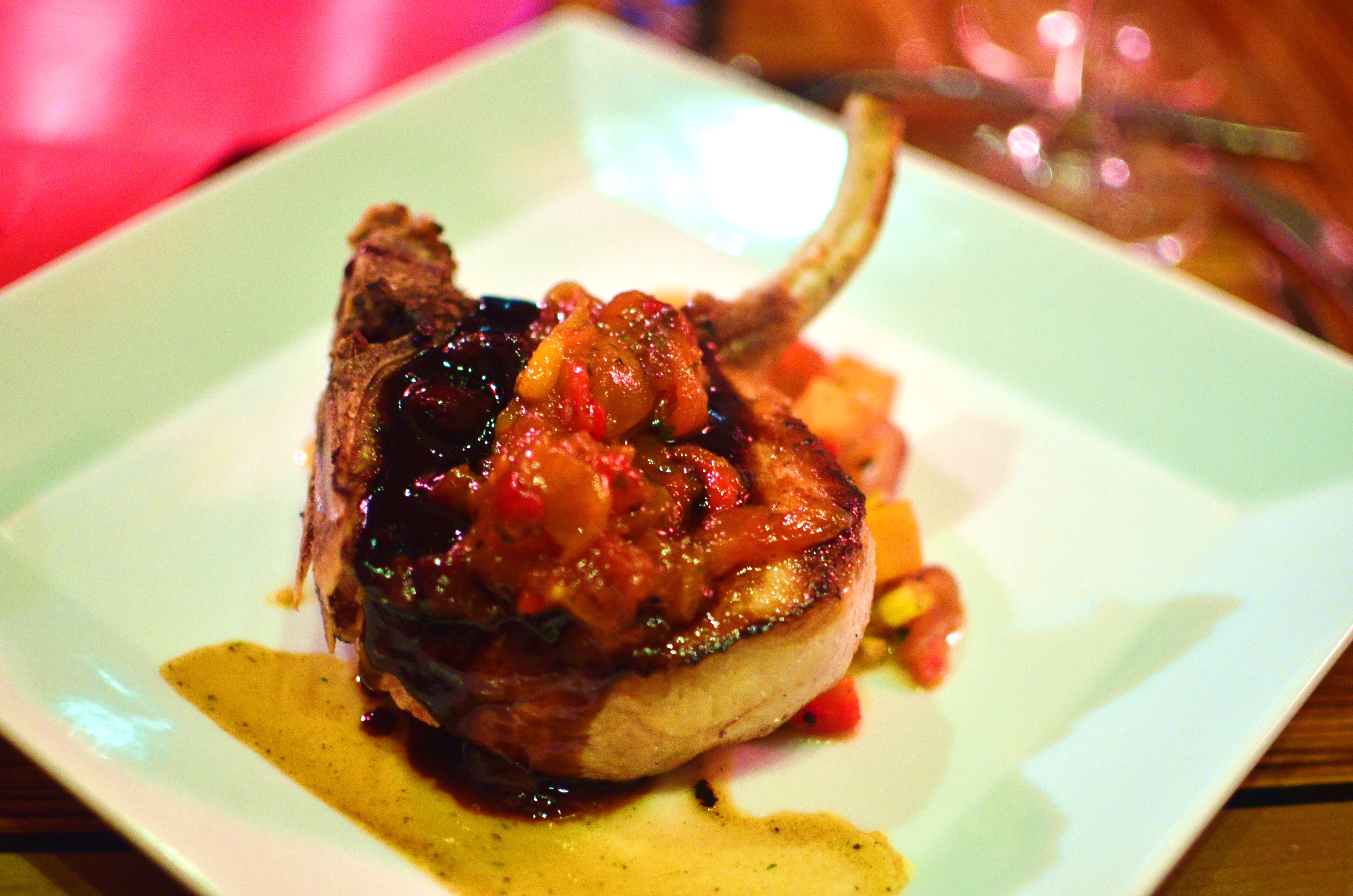 Fennel brined pork chop with sweet potato and corn hash, green tomato peach chutney, and red eye gravy