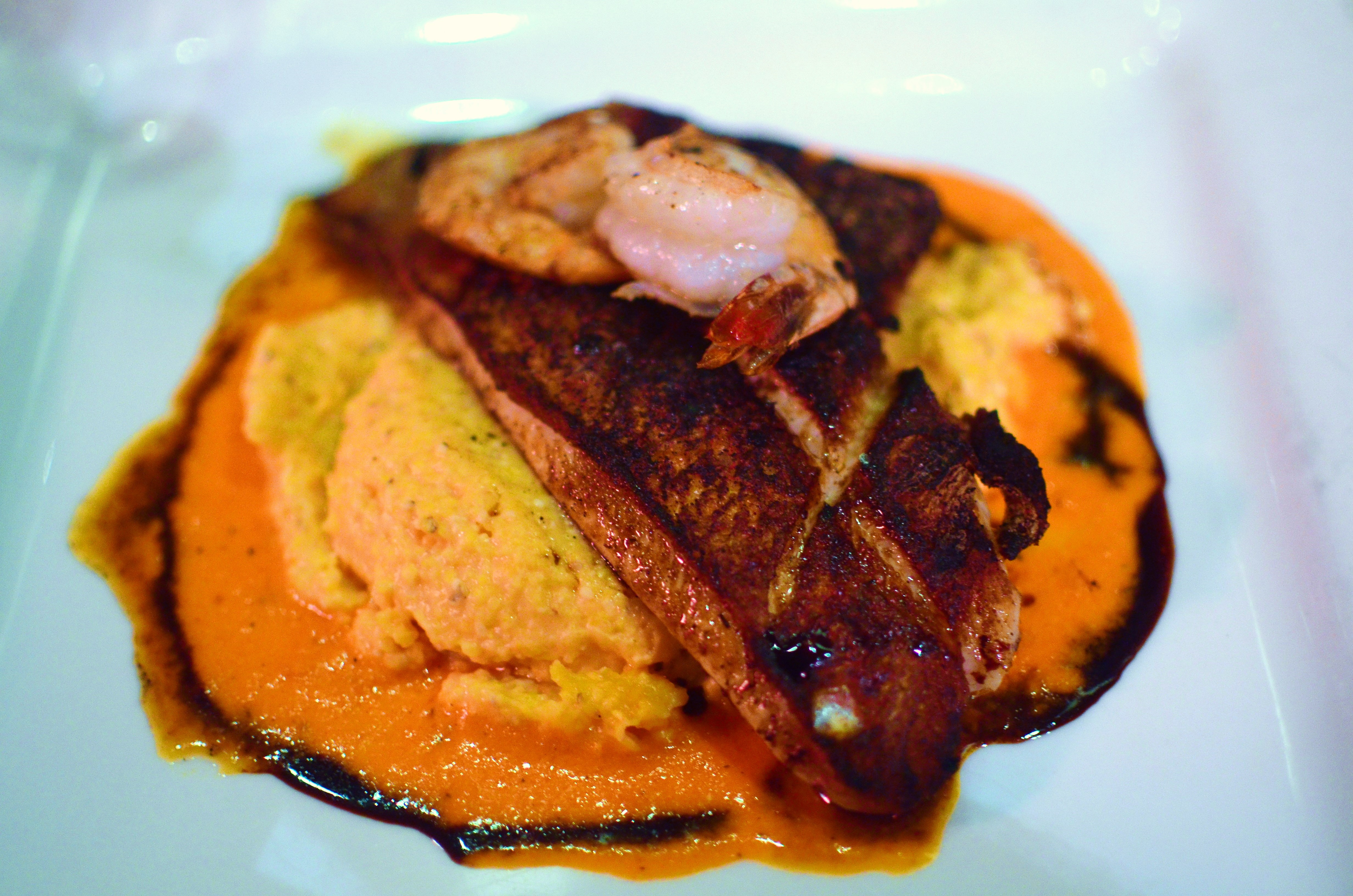 Blackened snapper and grits with bay shrimp, tomato harvati grits, red pepper goat cheese coulis, and balsamic reduction