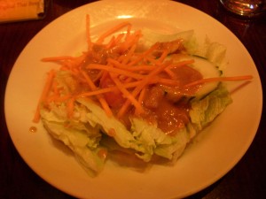 To be fair, the last two in our party were about 5 minutes late, but it didn’t really matter. Clearly the restaurant was full, and they had not set aside a table for us. The guy told Josh that a few tables were ready for their checks and it should only be a short wait. So we stood outside, shivering, clutching our bottles of beer and wine. Another fairly large group showed up after us without a reservation (not that it made a difference) and we told them we were waiting for a table. Since they didn’t know about the BYO policy anyway, we sent them across the street to Wondee Siam II where the space is larger and there would probably be more tables available.