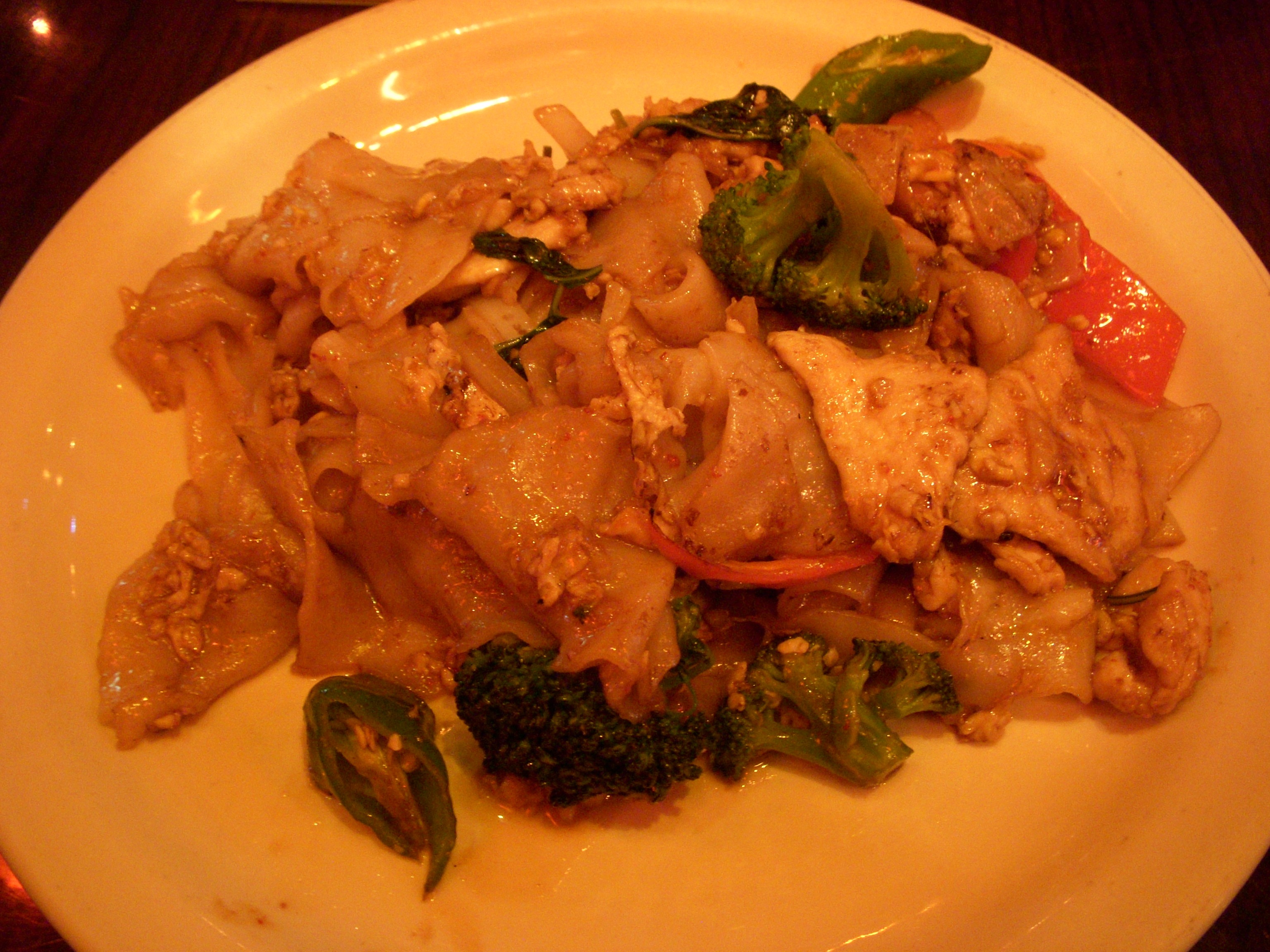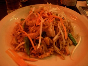 Josh and I decided to share our entrees though we debated for a long time about what to order. As I’ve said before, I’m not a fan of Thai curries, so our options were a bit limited. We finally settled on tofu with eggplant in basil sauce and the pad thai with beef. The tofu was similar to the fried tofu appetizer we had, except that was soaking in the sauce so it didn’t retain any crispiness. They ended up being a bit too chewy and tough though, so I actually preferred the pieces of eggplant instead. The basil sauce was a teensy bit spicy but not terribly so. I’m sure they could adjust the heat accordingly if you request it to be spicier or milder.