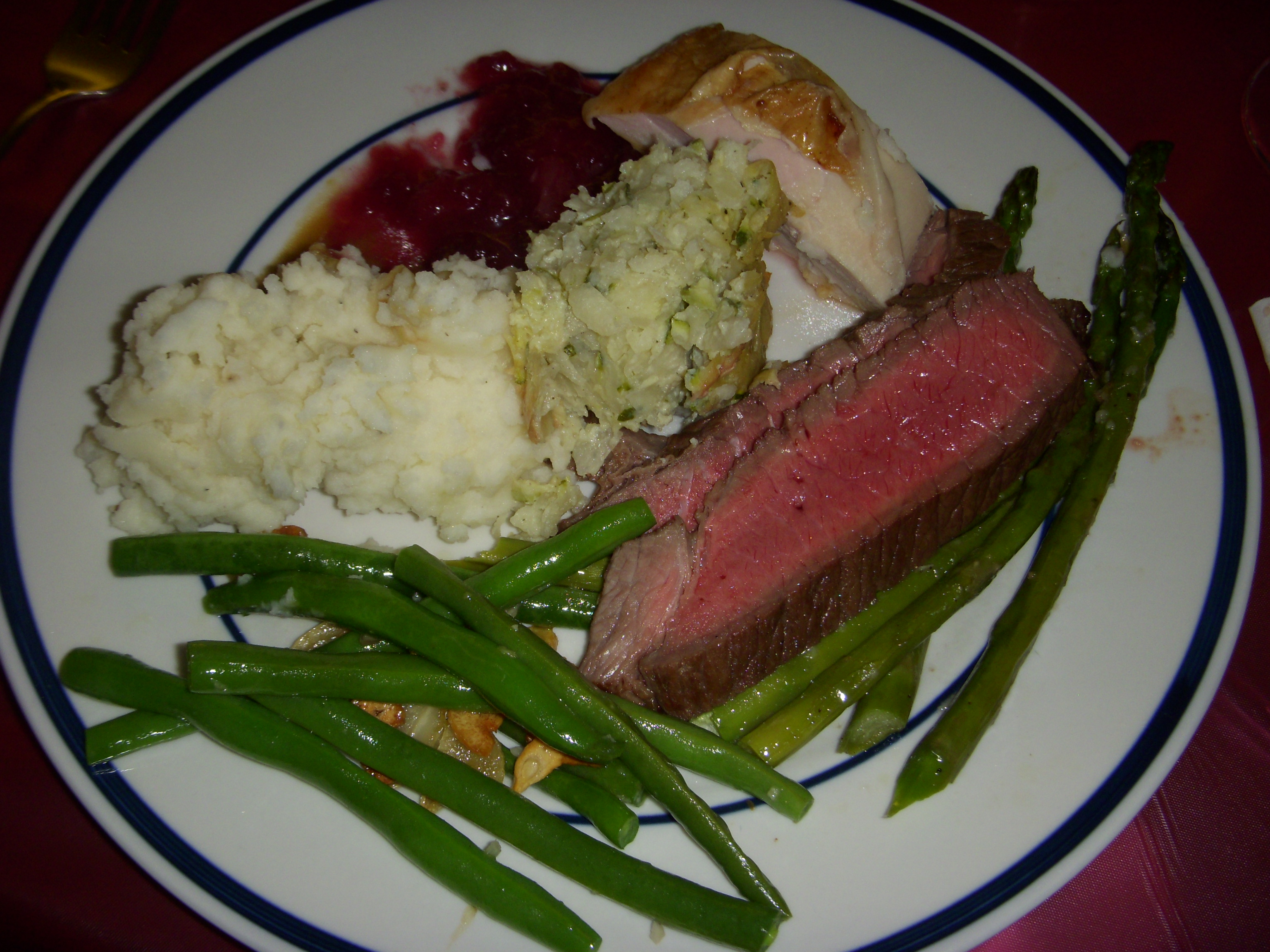Ribs up top, fatty and lean brisket, pulled pork, turkey on the left, plus bread and cole slaw