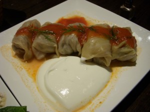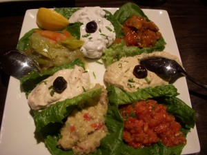 The cold appetizer platter included hummus (mashed chickpea and tahini paste), lebni (thickened yogurt mixed with dill, garlic, walnut, and herbs), chopped tomato salad (hand chopped tomato, bell peppers, onion, garlic, and walnuts mixed with red pepper paste), eggplant salad (smoked eggplant mixed with mashed garlic and roasted red pepper), and a few stuffed grape leaves.