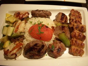 We ate most of the pita bread and put a good dent into the appetizer platter, but there was still tons left so we had them wrap it up for us while we went to work on our entrée, the Istanbul combo. The giant platter came with chicken shish kebab, lamb shish kebab, kofte, doner kebab, and lamb chops, all served on top a bed of rice. The rice I think was a bit undercooked, as it had a strange crunchy texture to it. I know there was orzo mixed in with the rice, but that wasn’t what was making it crunchy (I made sure to try a forkful sans orzo). There were also grilled tomatoes and peppers, but the peppers turned out to be jalapeno, and super spicy! I’m not sure why they served the jalapenos, and if it was intended to be a garnish, but they were way too spicy to be edible. Yikes!